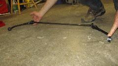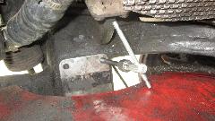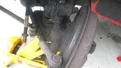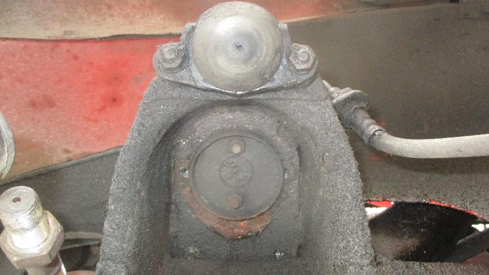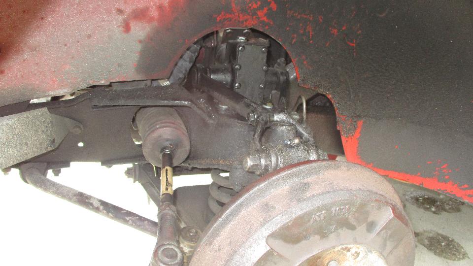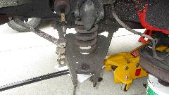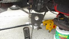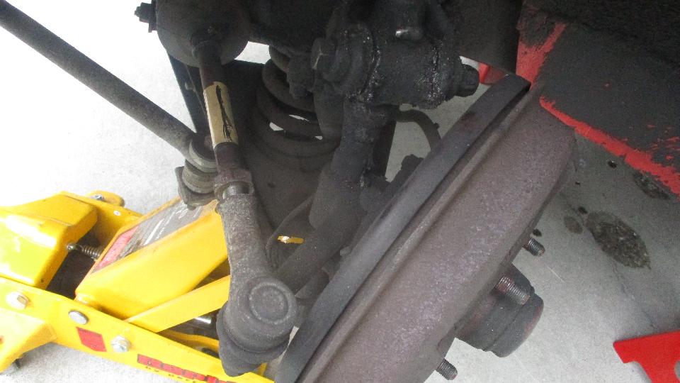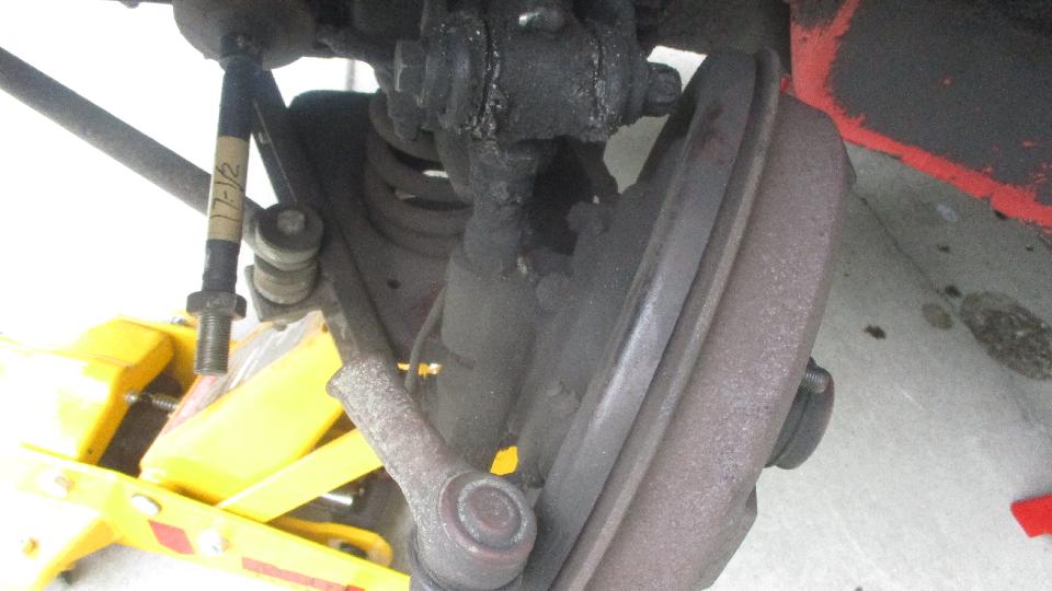Not long to jack it up and disassemble the LF suspension. Raise the A-arm to unload all suspension parts except coil spring. Tape the tie rod and count turns for disassembly, to be able to put is back in same position after reassembly. Remove upper and lower trunnion bolts to set aside the swivel pin assembly with brake parts. Disconnect the sway bar (yes it is fatter than original issue). Loosen nuts on A-arm inner pivots to allow the MGB GT V8 style bushings (with inner steel sleeve) to rotate. Lower the floor jack and press down A-arm to remove coil spring.