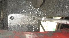 Removed the front carburetor for access to top of frame at the shock mounting pad. Drill out the remaining stripped thread using the special Heli-Coil tap drill, and tap the installation thread using the special Heli-Coil thread tap. Had a space problem with not enough clearance to swing the tap handle, so used a 11/32-inch 12-point socket to drive the tap. Now we're cooking, new seating thread straight and clean as a whistle.