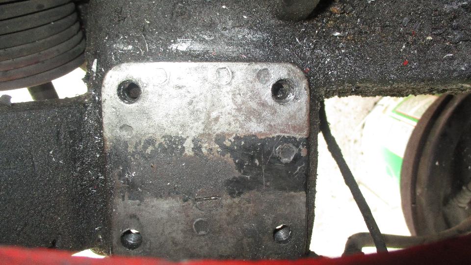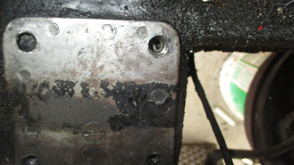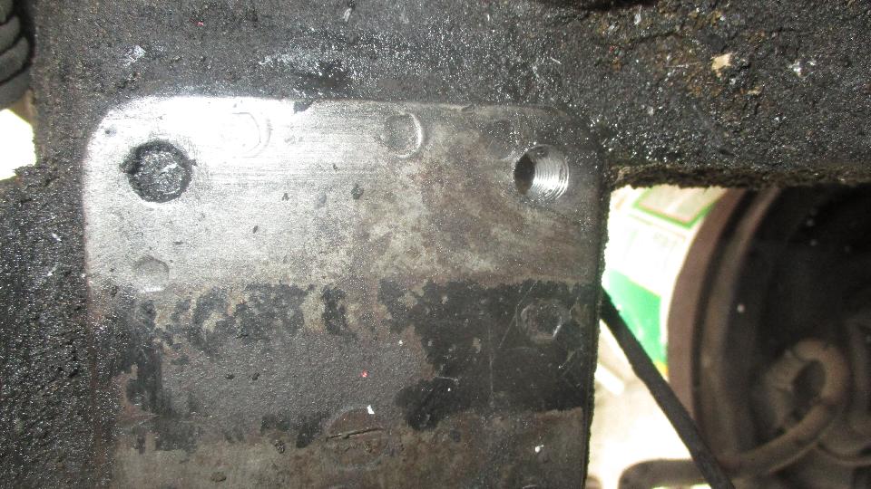 Removed the two outboard studs I had holding the shock absorber (and upper suspension arm) to reveal the inboard broken stud and inboard stripped thread. The idea was to drill out the broken stud and install a Heli-Coil in the other hole working from the bottom, but those locations happen to be above part of the chassis frame, so back to working from above.