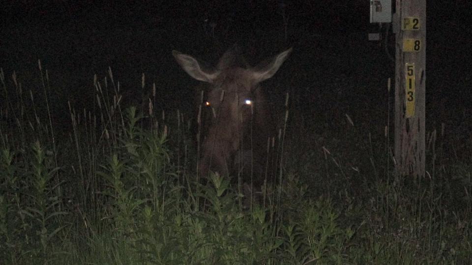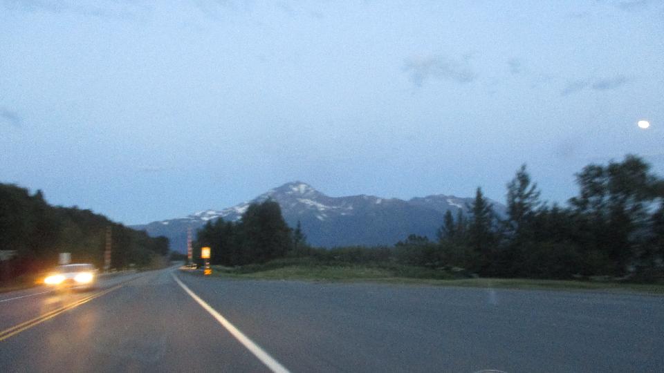 Heading farther back up AK-1 we were spotting a number of Moose (lots of them) grazing on grass beside the road. Easy enough to see in the dim light, not so easy to get the picture without flash, and the first flash disturbs the moose to walk away. Well past midnight it was time to get some sleep (while it is still dusk).