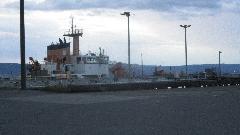 Boat launch ramp, a harbor service boat, and one of the cruise ships.