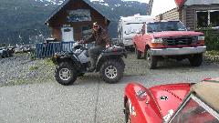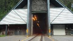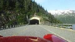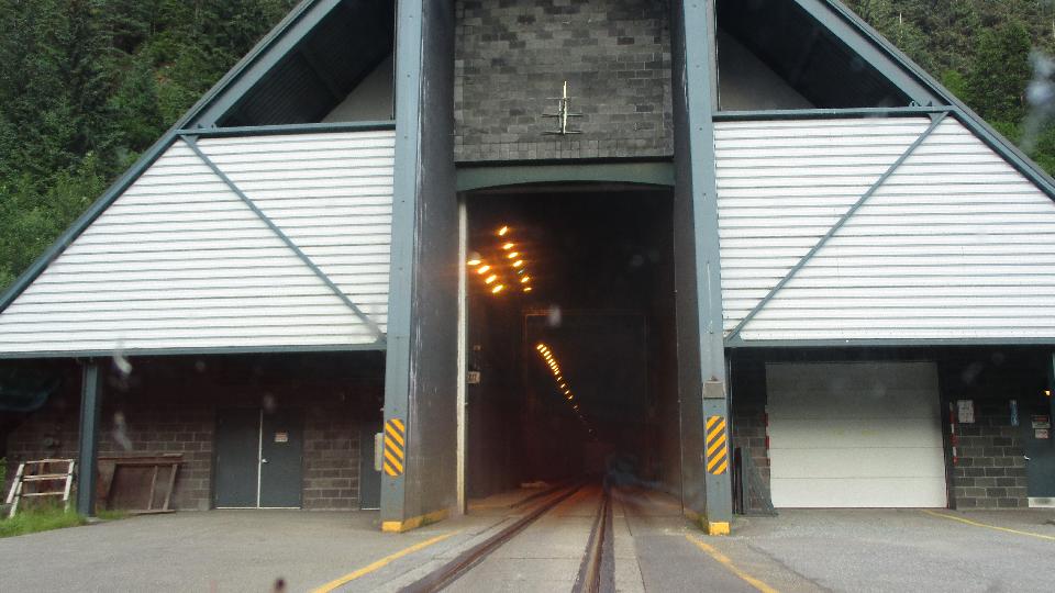 Final approach to the town involves driving through a tunnel. There was a toll (for round trip) which we thought was supposed to be $13 for a car which should include a small trailer, but we were charged $22 for a different class, such is life. Single lane train tunnel, 2-1/2 miles at 25-mph makes six minutes in the tunnel. Traffic controls at both ends to share with trains and 2-way car and truck. Yes, semi trucks will fit through. Be sure to stay in your lane. The guy on the ATV backed up for a second look. He claims his first car was an MGA.