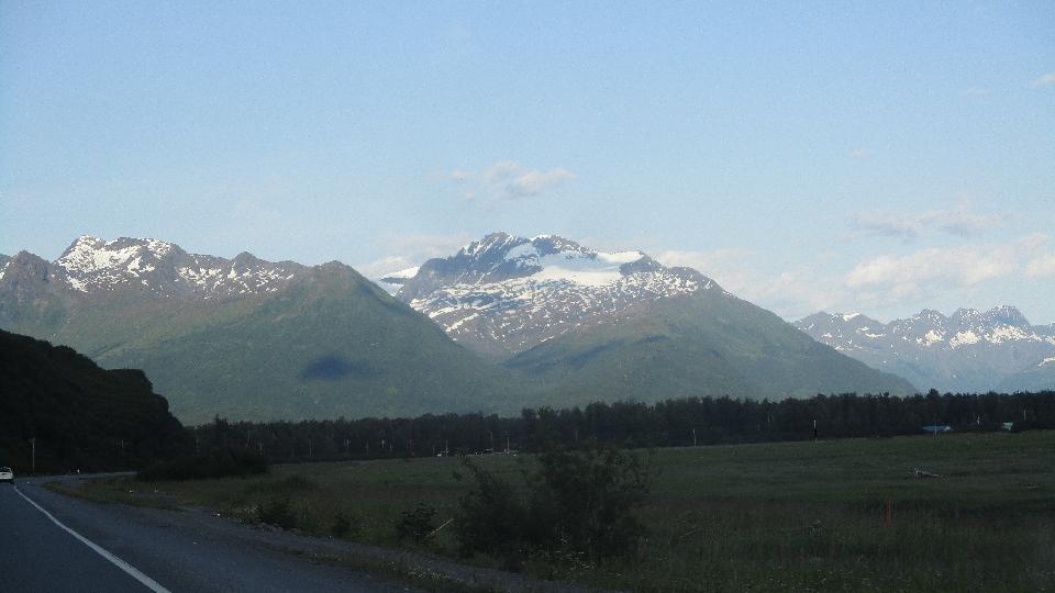 Next intended destination was Valdez, AK. Last night late we decided to move a bit farther along. Heading in the direction of Glennallen, we drove a little farther than anticipated, and ended up driving some in the dark. Around 1-am we had a "moose encounter" in a rather dramatic fashion. Moose in the road, quick swerve to miss the moose, locked up the brakes got sideways, did a 270 in the road before stopping. Woo-hoo, exciting stuff. End result was jackknifed trailer whacking a bumper overrider, which didn't look too bad in the dark.