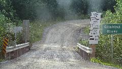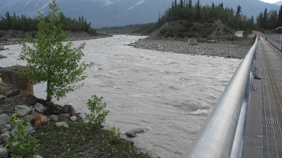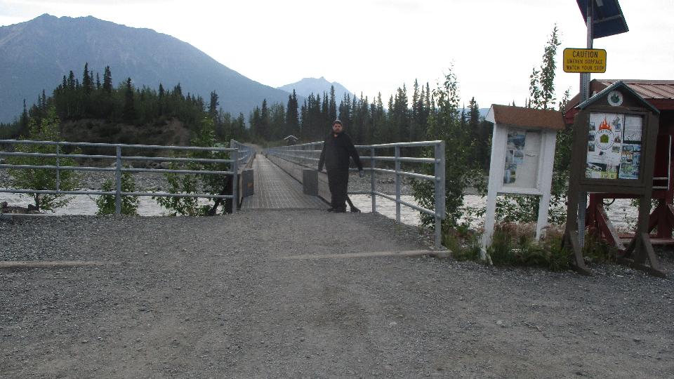 Made a fuel stop just before 10-pm, then headed through Chitina and 20 miles farther down McCarthy Road. Nesting spot for the evening (around 11:30-pm) was at a long single lane bridge crossing a deep gorge with rapids underneath (photos below). Bound and determined to fight our way through the rubble road to get to McCarthy. Will have plenty of pictures of the road to McCarthy tomorrow.