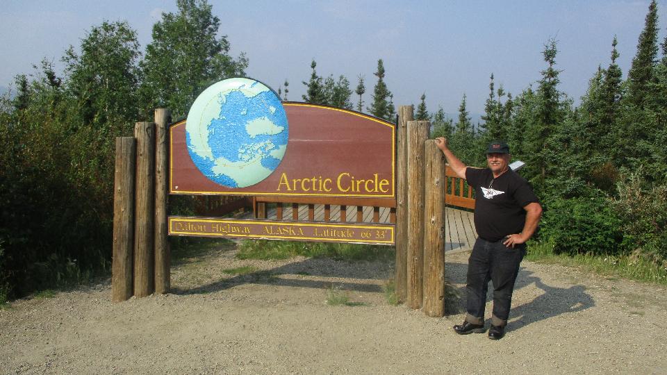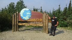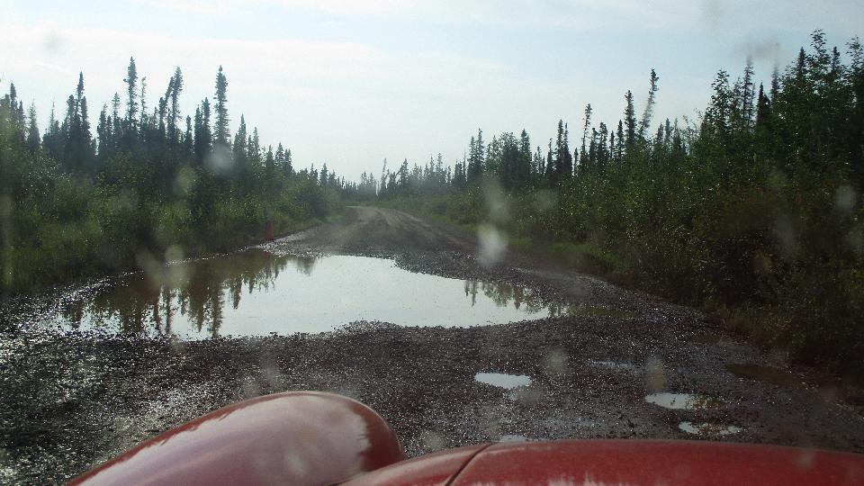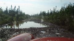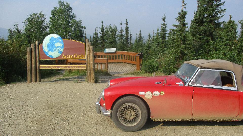 Some people might stop here, tank it up and go back, but we drive on. Another 60 miles up we came to the Arctic Circle crossing with a marker for the tourists. I have been told that the real Arctic Circle is something like four miles farther north, but the signpost station was long ago moved to this location to have a bit more space for parking. The gravel road is often watered to keep down dust, so the car (and trailer) will pick up mud as we go.