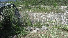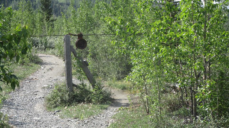 Rotting pilings are all that remains of an old bridge. Also both ends of the old hand operated cable tram now long out of service.