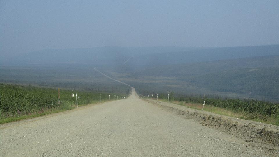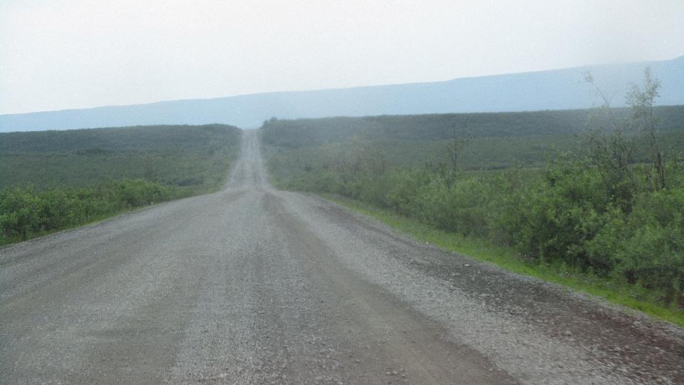 Headed north from Fairbanks, 500 miles to Deadhorse to visit the midnight sun and the Artic Ocean. 80 miles out of Fairbanks on the Elliot Highway, enter the Dalton Highway (originally called the North Slope Haul Road). It was built to support the Trans-Alaska Pipeline System in 1974. It was originally a private road with check points, requiring special permit for access. When I was last here in 1997 it had been open to the public for only a couple years, and few people came this way. Last time I saw this sign the result was the only time in my life when I drove for three days without exceeding the speed limit, the trip being 14 hours each way, all gravel, some of it very rough. Previously 15 and 18 miles in we had two blow-outs on the trailer, so left it behind for three days and picked it upon the way back, but it was "Deadhorse or bust". The road turned out to be slightly improved, so this time the trailer would be tagging along the whole way. You can soon get very lonely out here. There would be about 100 semi trucks per day using this road, so it's not like you would get stuck, just dusty and rough, so be conservative and try not to break the car.