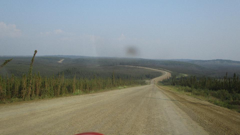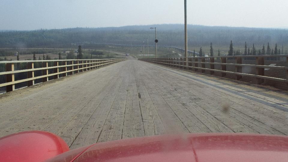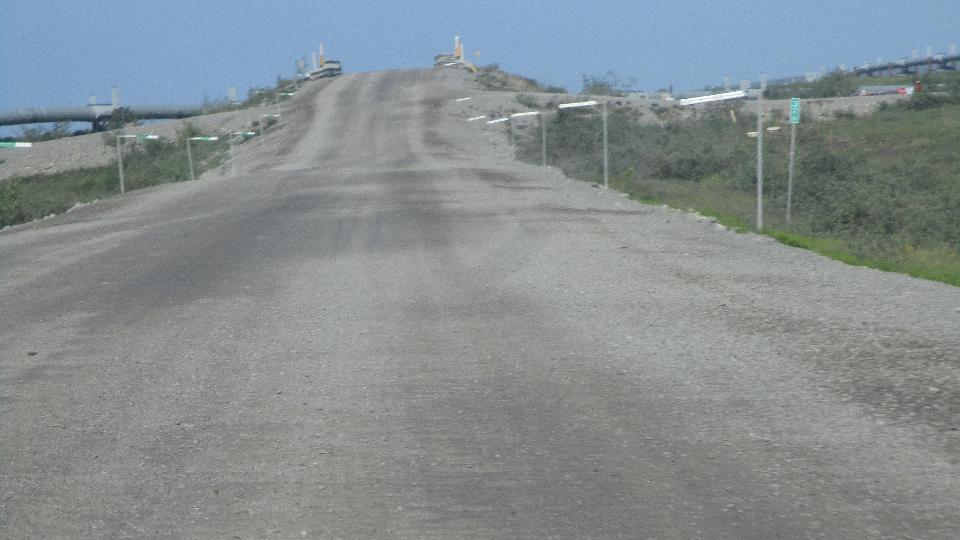 The pipeline soon becomes your friend, sometimes on the left or right, occasionally underground, often out of sight in the mountains. The haul road takes a slightly longer route winding around the hills to limit steepness of the grades. Even then some of the hills were flat out in 2nd gear for a couple miles at a stretch. 60 miles up (140 miles from Fairbanks) the long bridge is the Yukon River crossing. You can get fuel here (at a premium price if you need it), but the next fuel stop is only 116 miles farther on (check your fuel gauge).