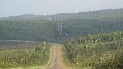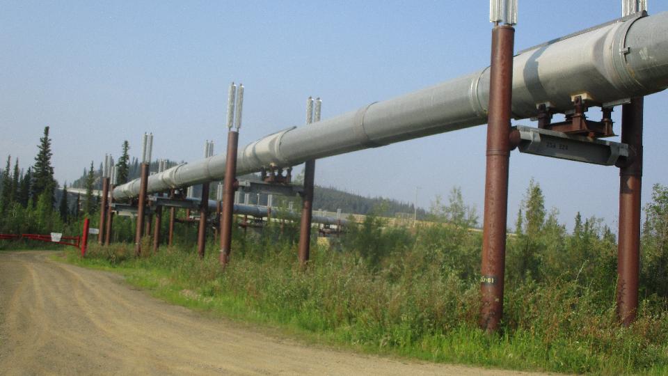 This is also a good place to get a close-up look at "the pipe". For engineering detail, the oil carrying pipe is 4-feet in diameter with a 1-foot thick insulation jacket and 6-foot diameter outer metal cover. Crude oil is mixed about 50% with water and heated for easier flow. The pipe supports are embedded in frozen ground (permafrost). To avoid melting the permafrost the pipe jacket has additional insulation at the support points, and the vertical legs are heat pipes with boiling volatile fluid inside that will transfer heat from the legs to cooling fins on top.