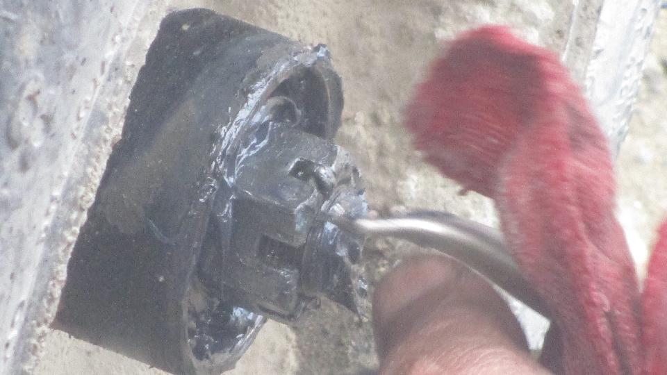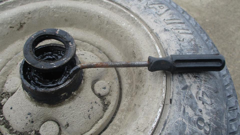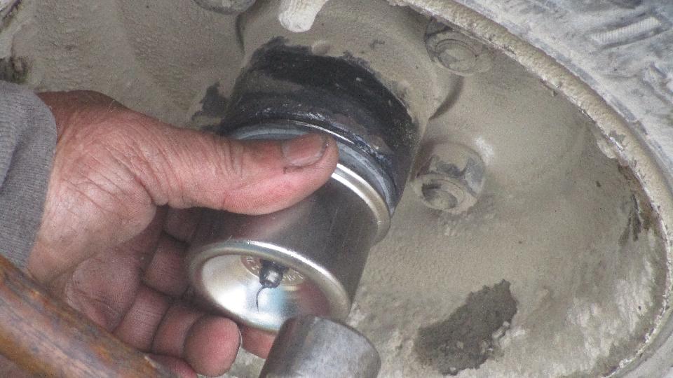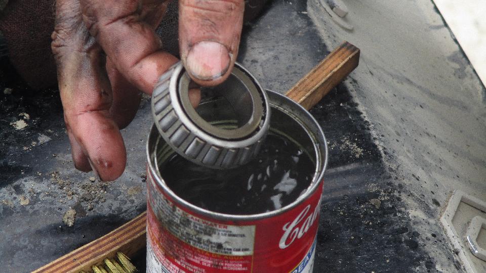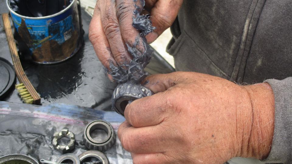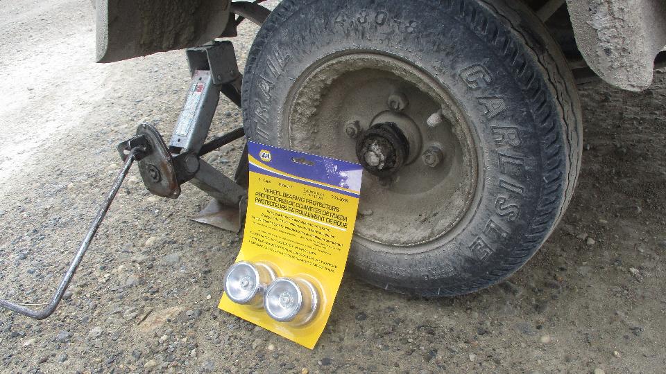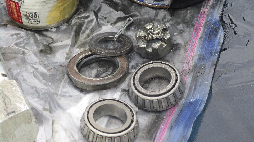 Picked up new all steel Bearing Buddies at NAPA in Deadhorse (yes, there is one there). R&R the trailer hub complete with wheel and tire, wipe off some dirt and pull the bearings apart.