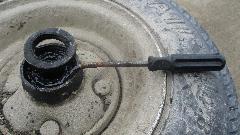 This tire was in amazingly good condition, mind-boggling for the professional tire technicians. I had a brief tear-jerking reaction with an overwhelming desire to stick it back in the boot. But it was time to say goodbye, conduct a brief memorial service, bless the thing and send it on its way to a better life (possibly to be recycled into new road surface).