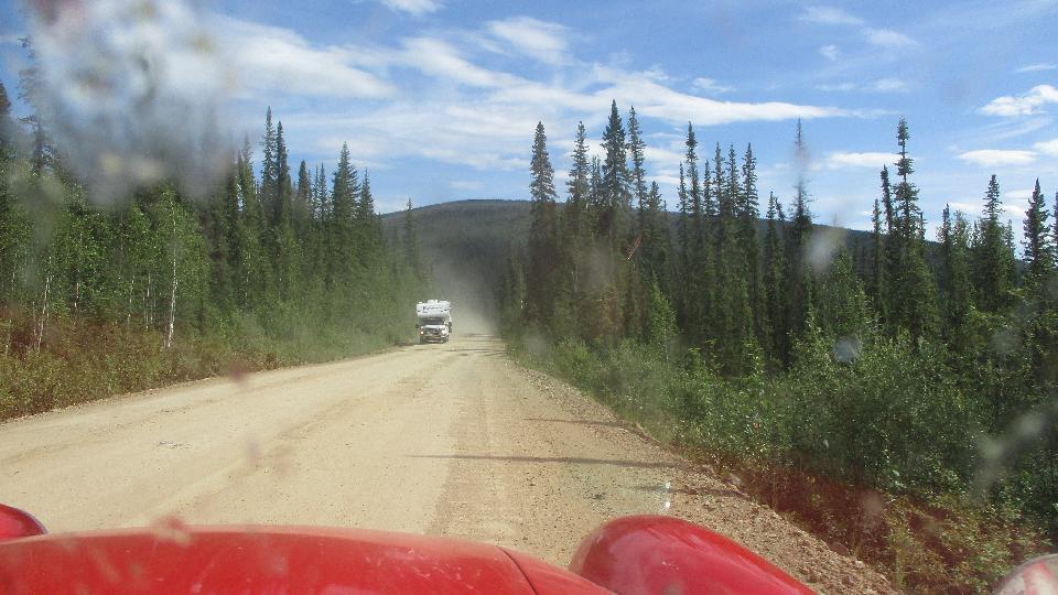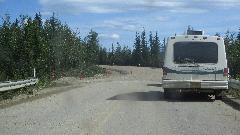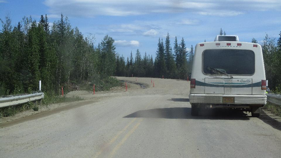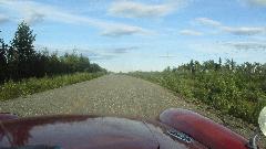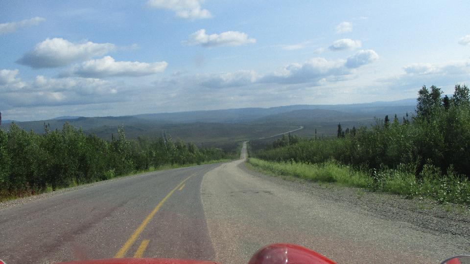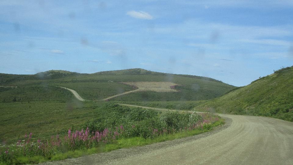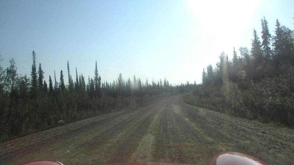 We picked up four gallons of (expensive) fuel before leaving town, enough to get us back to Fairbanks. Working our way back on the rough road, remember the big rock I mentioned earlier? Well, apparently I didn't remember where it was, and we hit it, making loud knocking noises as it bounced around under the car. But subsequently everything seemed to be okay with road conditions improving some with time.