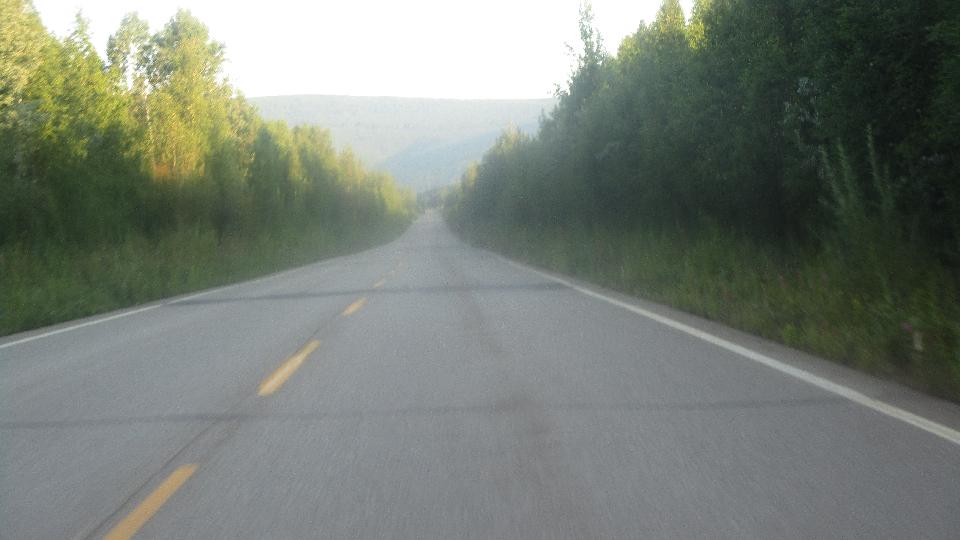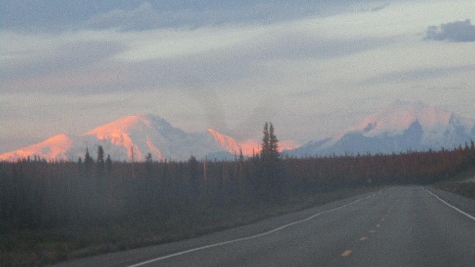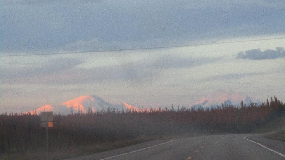 No appointments, so spent half the day catching up photos and notes and email, and then it was laundry day. Heading nor-east from Anchorage up the Glenn Highway in evening. Must have taken 40 pictures of sunset on the mountains to get one to come out right in the failing light. Made it a little past Glennallen and just onto the Tok Cutoff late night. One more picture of our last midnight in Alaska.