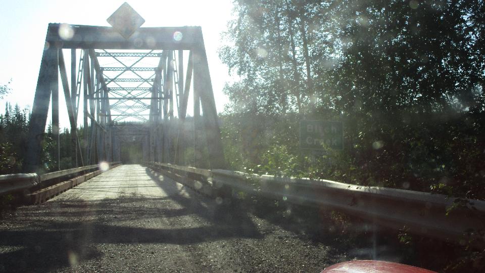 Driving into the low morning sun was a bit tough for visibility at times, here crossing the single lane Birch Creek bridge (lots of creeks in the mountains). 162 miles from Fairbanks, at road's end we went one turn too far ending up in a private drive. This picture may show half of the residences in Circle, being a very small town. Back to the town square, the welcome board on at the Yukon River. This is the farthest point north you have driving access to the Yukon River, a bit more north than the river crossing on the Haul Road. Apparently the town was named Circle because the founders thought it was on the Arctic Circle, but in fact it is about 50 miles shy of being that far north.