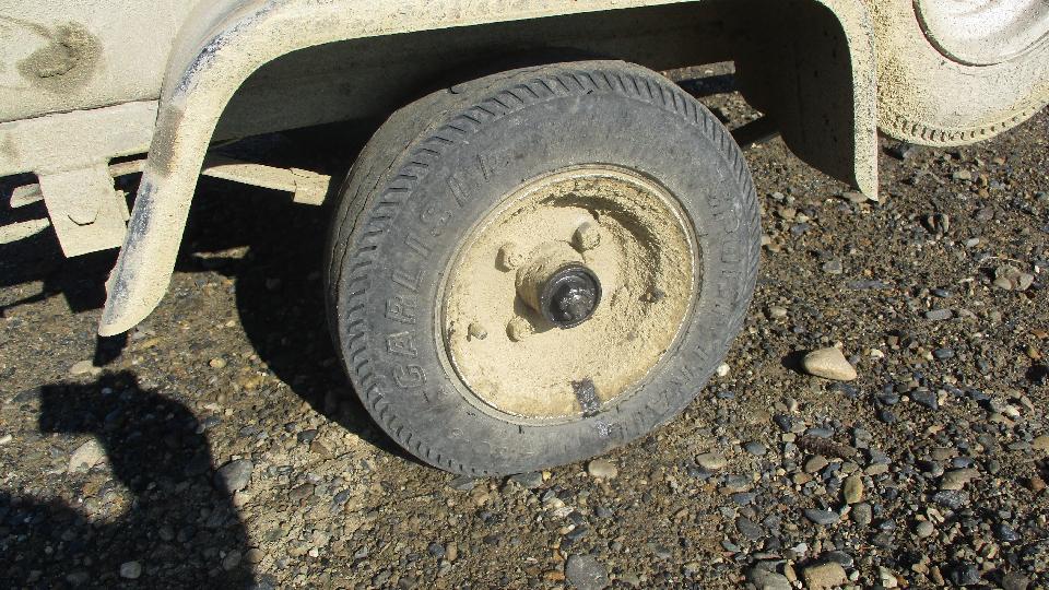 About 100 miles of gravel later we obviously had a flat tire on the trailer. You might recall the one trailer tire that had carcass failure early on on California. Now the mate to it just gave up the ghost, pretty much worn out with large chunks of rubber missing out of the tread surface. Didn't I tell you gravel roads are hell on trailer tires? Having gotten that last mile of these two, it was time to install the two new trailer tires (nice advanced planning this time), and put the 20 year old half worn spare back on the side mount. Having been accustomed to trailer tires making 25,000 miles or so, these last ones only did half that distance. Did I say gravel .... yes I did. Clean off some mud and toss the junk tires back in the trailer for future proper disposal.