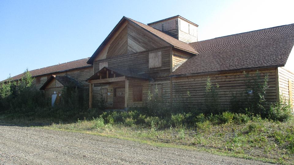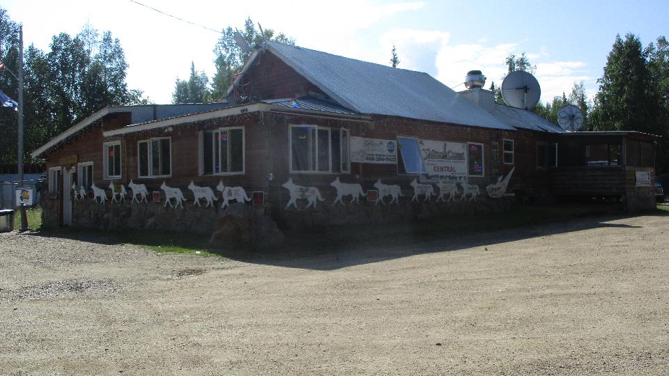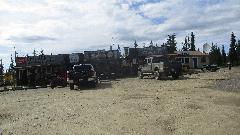 There is a boat ramp here, but maybe more often small float planes may land on the river to service sportsmen in the area. There is also a gravel landing strip just down the road, and small wheel planes will taxi up the Steese Highway to park and refuel in town. The low building is the local restaurant, bar, supply store. The dish antenna are a recent addition. The larger building now boarded up is a mystery to me. I don't recall it being here in 1997, as I do recall an airplane taxiing through that area at midnight on the way to the bar.
