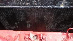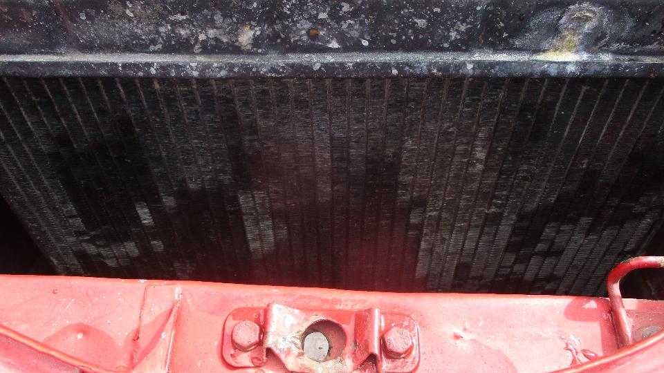 While I was swapping trailer tires, navigetor was cleaning bugs and mud off of the car radiator with lots of water, a wet rag and a little soft brass bristle brush. Too bad I didn't get the "before" picture, but a flock of bugs subsequently coated with mud had completely blocked air flow on half the radiator surface. Getting this cleaned off should reduce the heating issue under heavy working conditions.