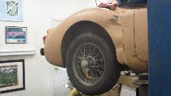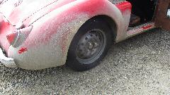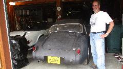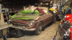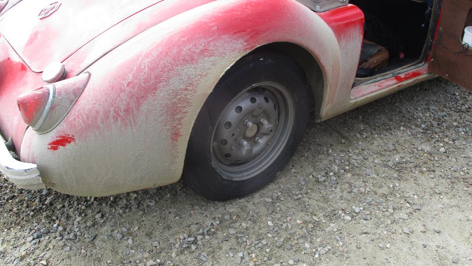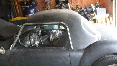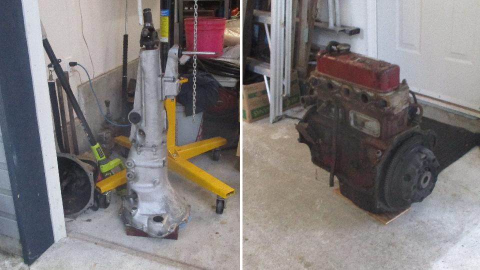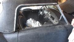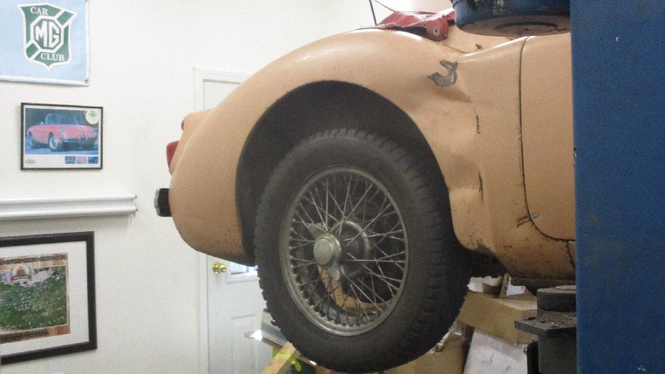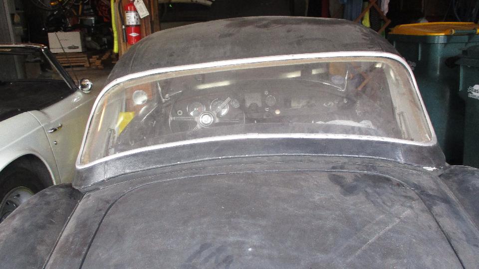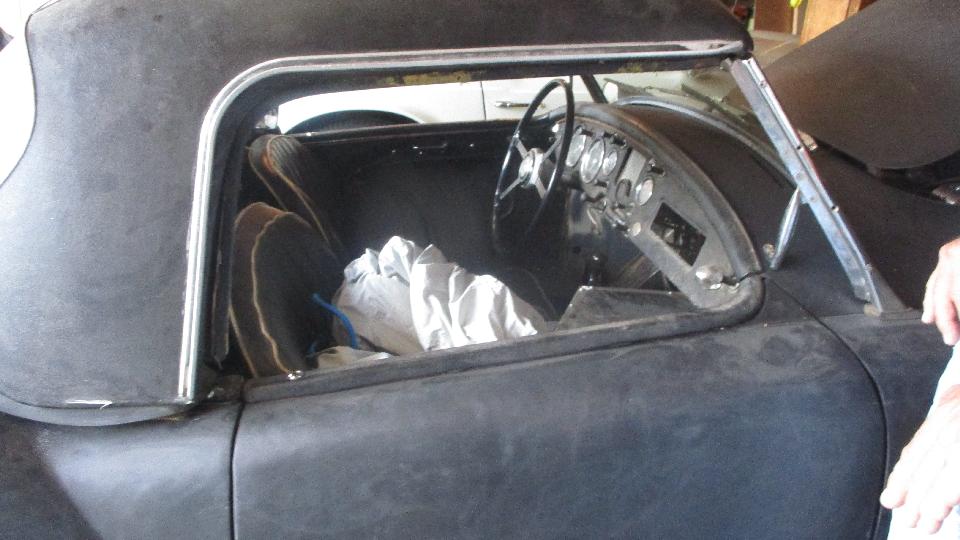 Of particular interest is the factory fiberglass hardtop, which was an accessory part for MGA 1600 (aftermarket for MGA 1500). This one apparently had a rough past life, looking like it had something heavy sitting on it for a long time to deform the LR corner downward, skewing the rear window in a strange fashion. This may be tough to fix. Suggest blocking it back to original shape and applying heat lamps for a while to see if it can revert to its original shape. -- Ken took a nice picture as we were leaving.