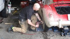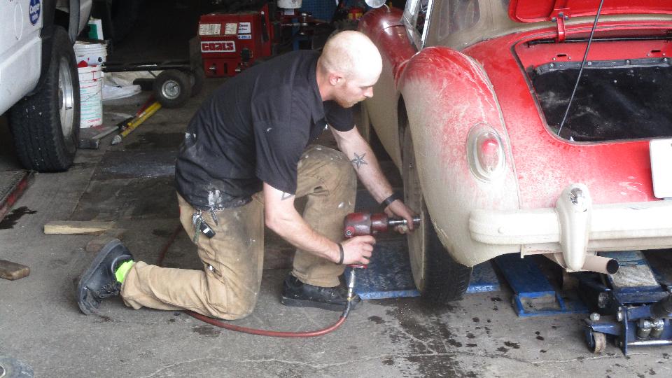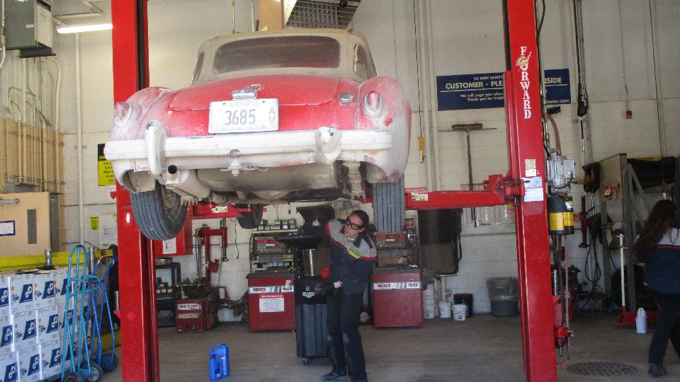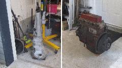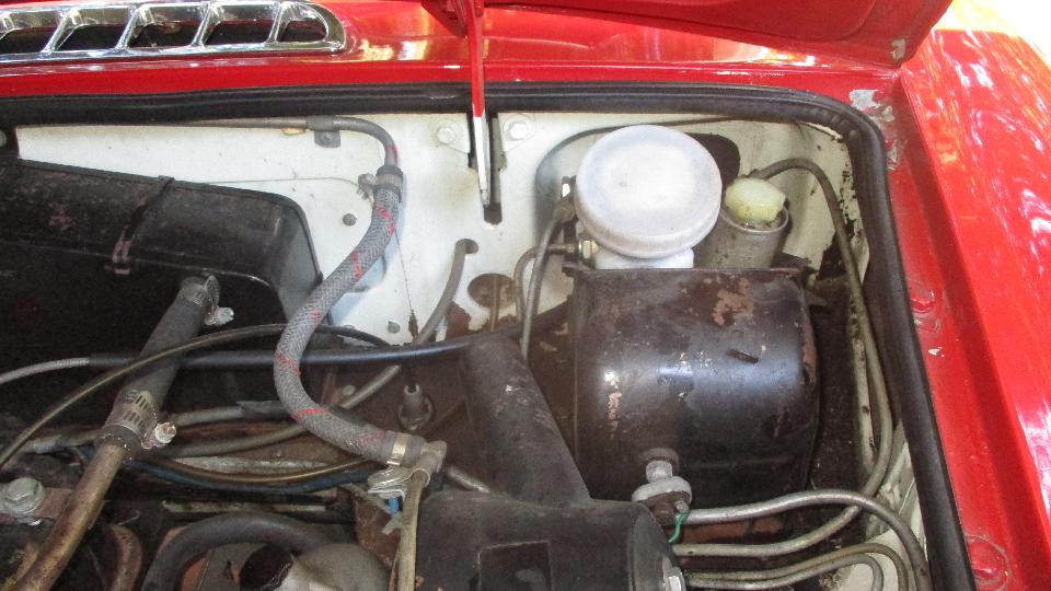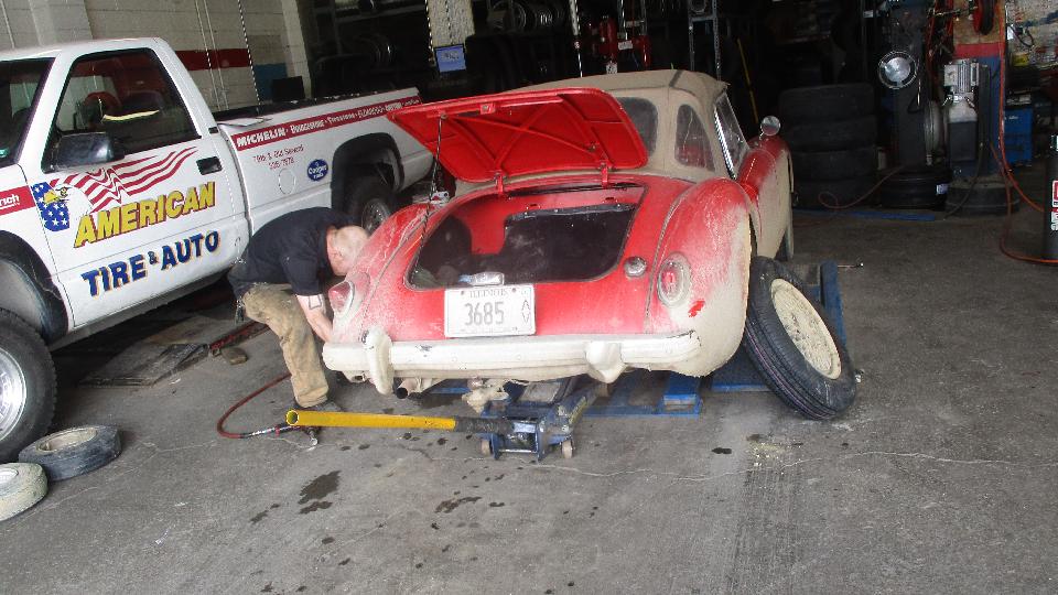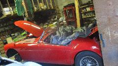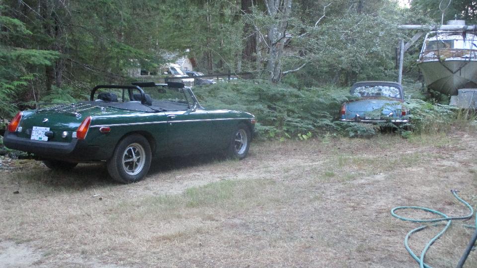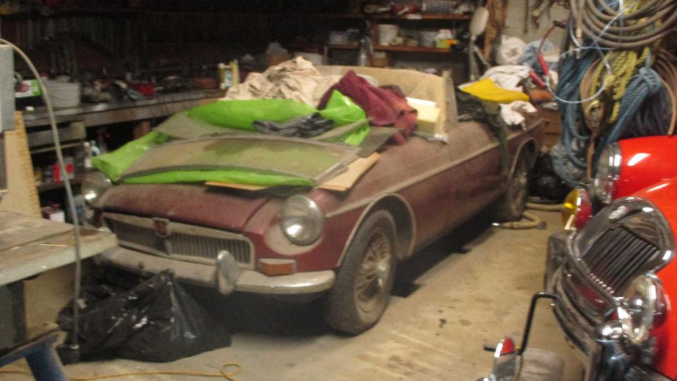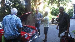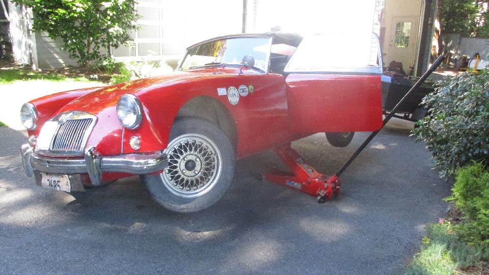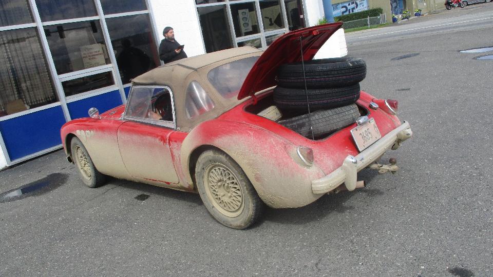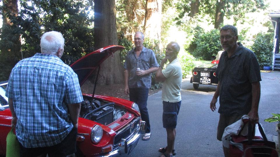 The red MGB, with current owner a couple of months, had air in the clutch hydraulics, leading to discussion about reverse bleeding. Lots of sidewalk supervising for the project MGA being recommissioned without restoration. Give it another week or so to get fuel tank and brake hoses installed, engine in and see if it drives.