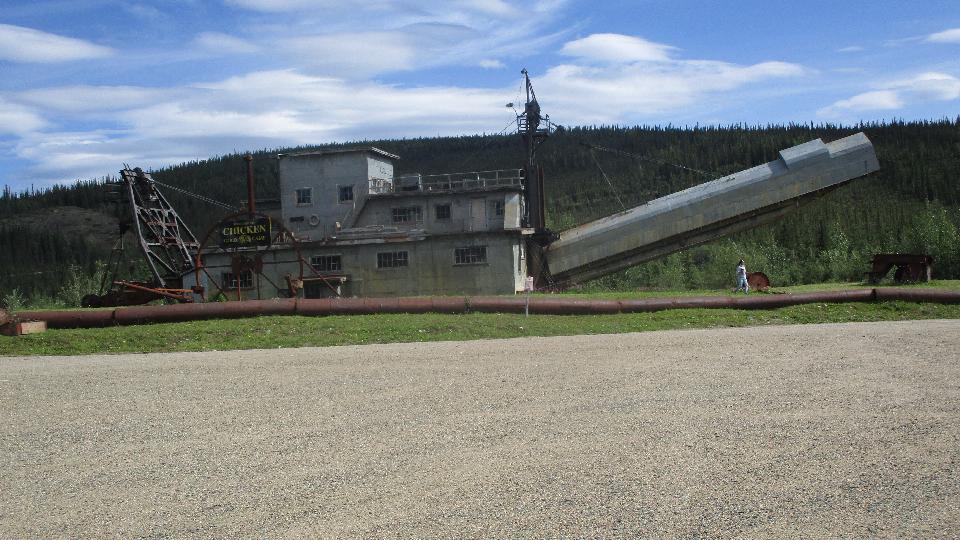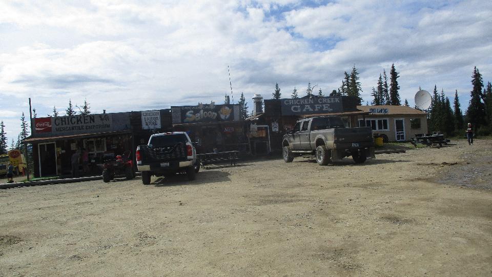 Yup, sure enough, out of touch for three days, but now time to catch up with photos and notes. Headed east out of Tok and hung a left for 94 miles on AK-5/Taylor Highway. Roads are much better than 20 years earlier, some of it now sealcoated, and the gravel parts much improved, this was almost too easy. Well, not all easy, considering construction delays. Below right, what used to be more than half of Chicken, AK, missing Post Office and school.