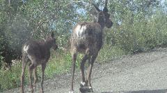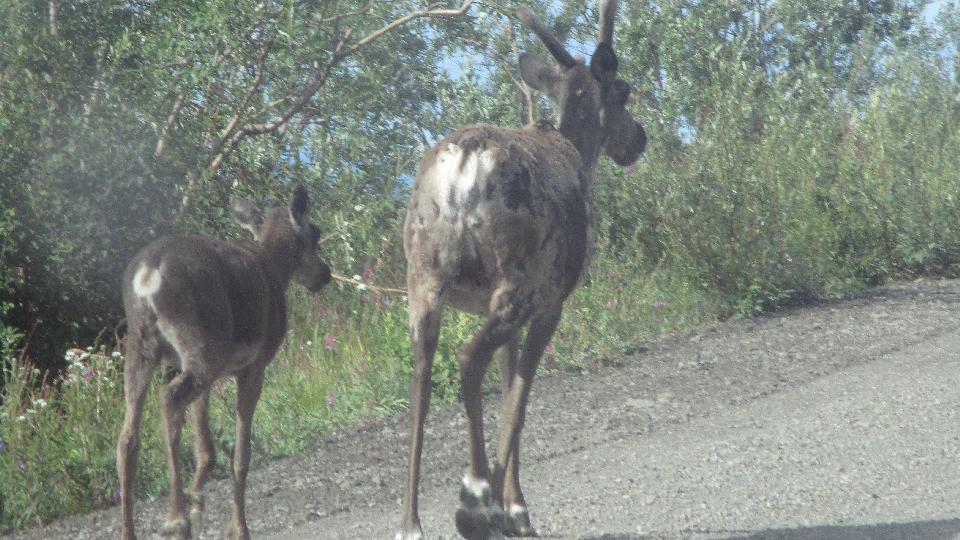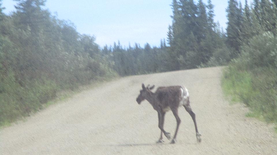 With some improvement in the roads comes more traffic and tourism. They have dramatically increased the size of the town, now including another restaurant, fuel stop, convenience store, camp ground, maybe a rafting company, adn air service. Boo, hiss, no more frontier. The mining dredge that used to be rotting away missing boards, rusting and full of holes has been somewhat refurbished, still not functional, but now looks like some sort of attraction for the tourists (along with the gold panning franchise). From there on the dusty gravel roads were more like I remember, but if the motor home can get through anyone can. Hello little caribou.