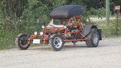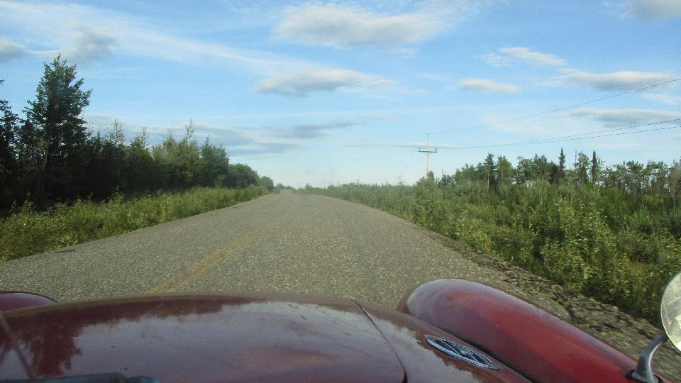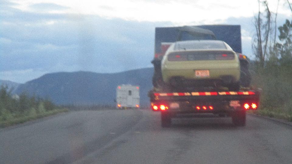 260 miles from Whitehorse we made a fuel stop late night at Nugget City near Watson Lake, YT. Here we met the road touring Dune Buggy. I suppose if motorcycles can do it this guy can. This is also where we catch YT-37/Cassiar Highway heading due south. The road surface deteriorates some, but still mostly sealcoat wih a few short stretches of gravel. I dunno what the car on the flatbed was, just interesting seeing it out here at midnight.