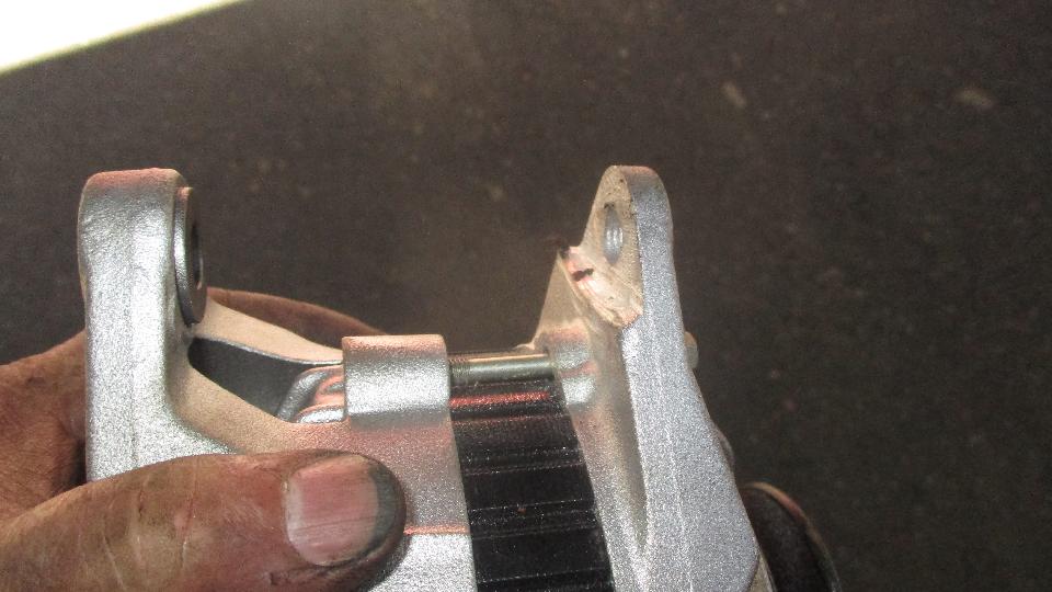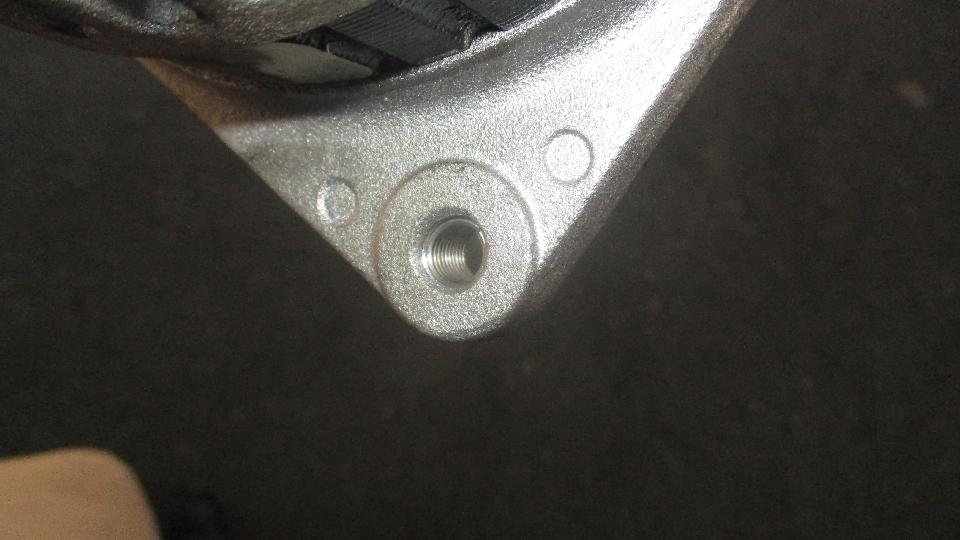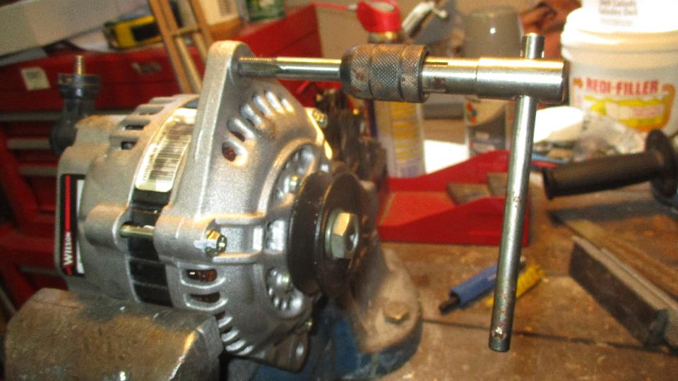 Then for the fettling. First, several minutes with an angle grinder to relieve the front mounting ear, plus a couple minutes with a hand file to make it acceptably flat. This is to get the pulley to line up with the belt in the MG. Second, a personal determination of mine, drill out the 8-mm thread and tap through to install a 5/16-24-UNF Heli-Coil, so I can use a "standard" 1/2-inch wench for adjusting belt tension, and not have to carry a 12-mm wrench in my traveling tool kit.