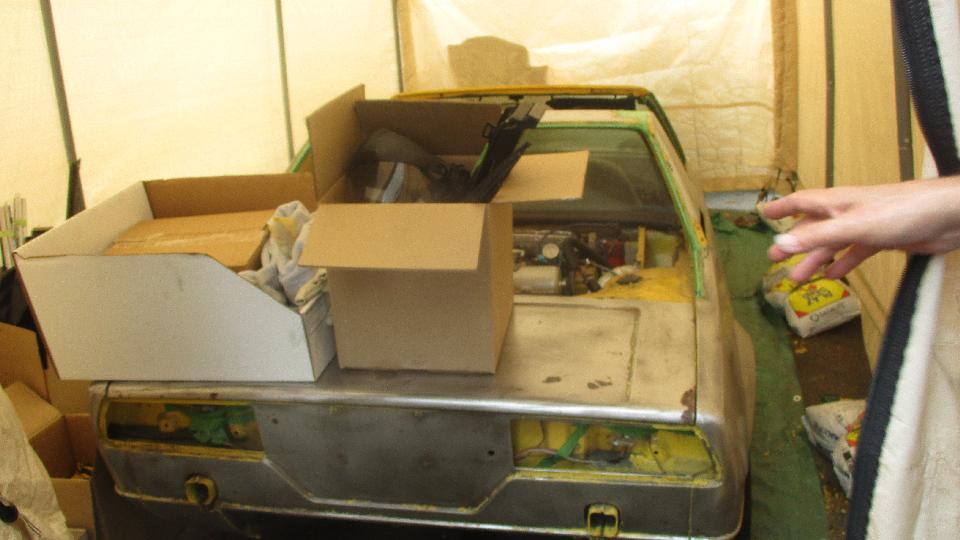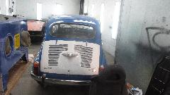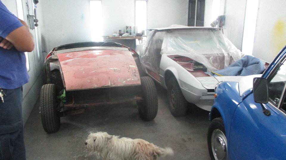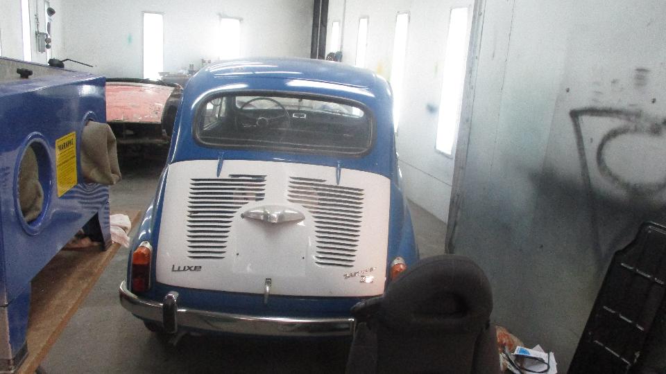 Inside there was this moderately rare Fiat 850 coupe, getting an engine-out repaint. And there was the Fiat Luxe 600 (being the "Deluxe" version of the Fiat 500). Behind it in the paint booth, most of an MGB, and another X19.