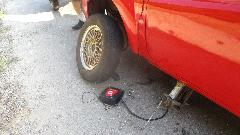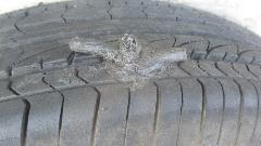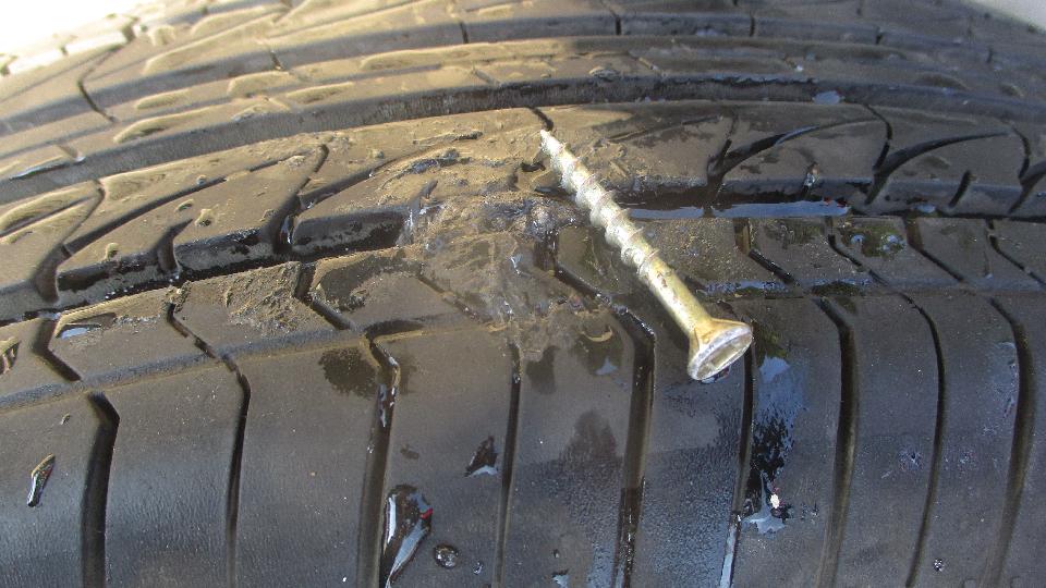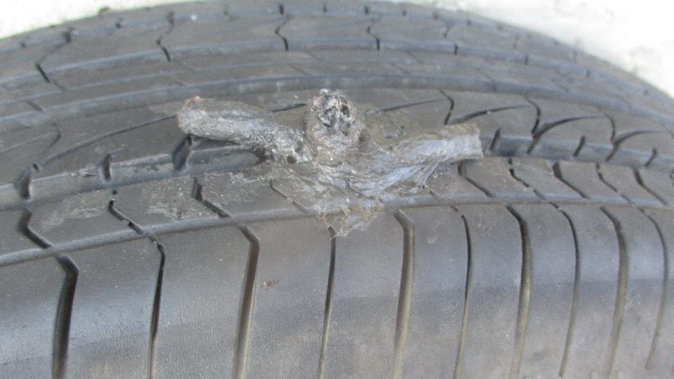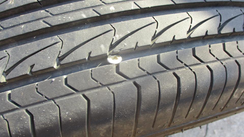 Woke up to mostly flat tire again, which answered a few questions With that leak rate the puncture had to have happened after we left Hope the night before, and we needed to fix it immediately. So jack it up, remove the wheel, and the problem was immediately apparent. We had picked up a Robertson screw, one of the square drive flat head screws used to assemble trailer homes and camper trailers. In short, not too long to plug it, air it up, get it back on the car, and drive on into Hope for breakfast.