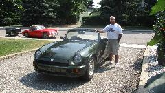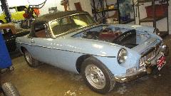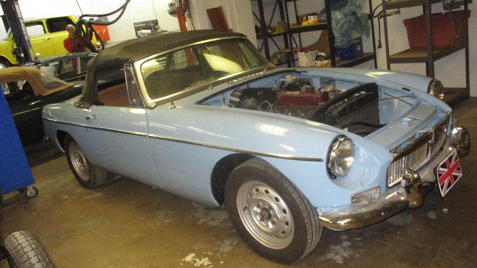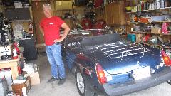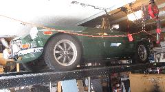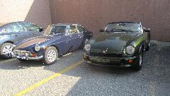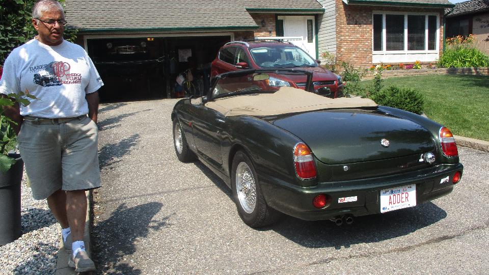 By mid afternoon, on the way out the door, we got to see Azim's MGs, two or them. He has a nice MG RV8, not seen much in the USA, but there are some of these in Canada. Inside the garage, up on the lift, was his MGB. The garage has a rather low ceiling, but with the MGB backed in with the top down and lifted very close to the ceiling, the RV8 can be parked underneath the lift. Have to smile at the close quarters double stacking.