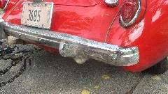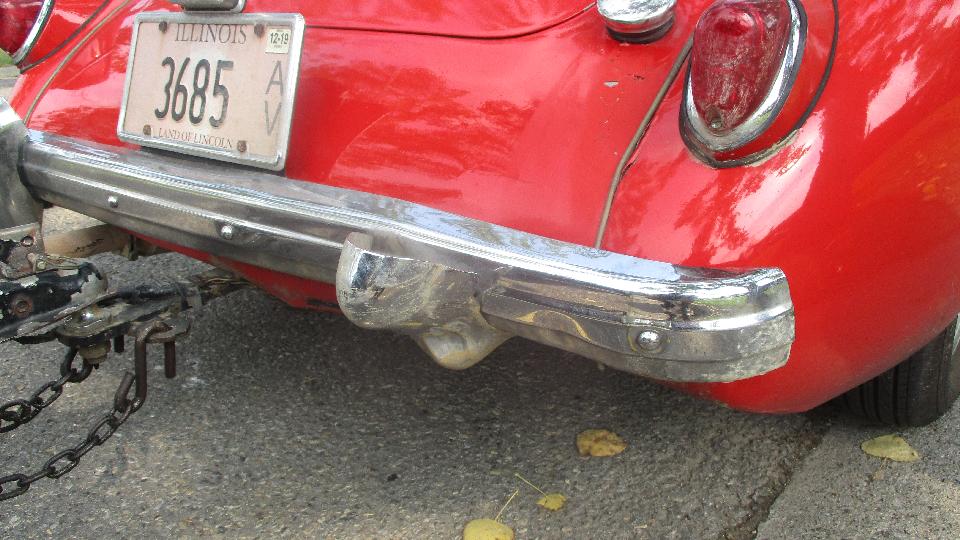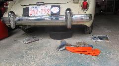 Alright! Remember the Alaskan moose encounter with my MGA? This was about to be a fairly easy fix. An angle grinder made quick work of removing the distorted overrider. After slight straightening of the bumper bottom flange, and a bit of correcting twist with a pry bar, the replacement overrider was installed in short order, and the daily drive MGA was looking much better.