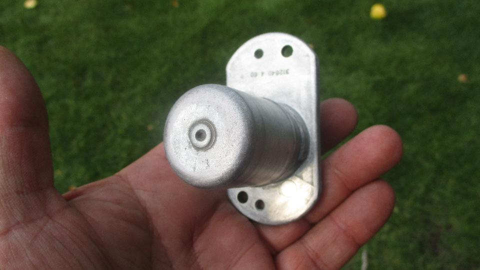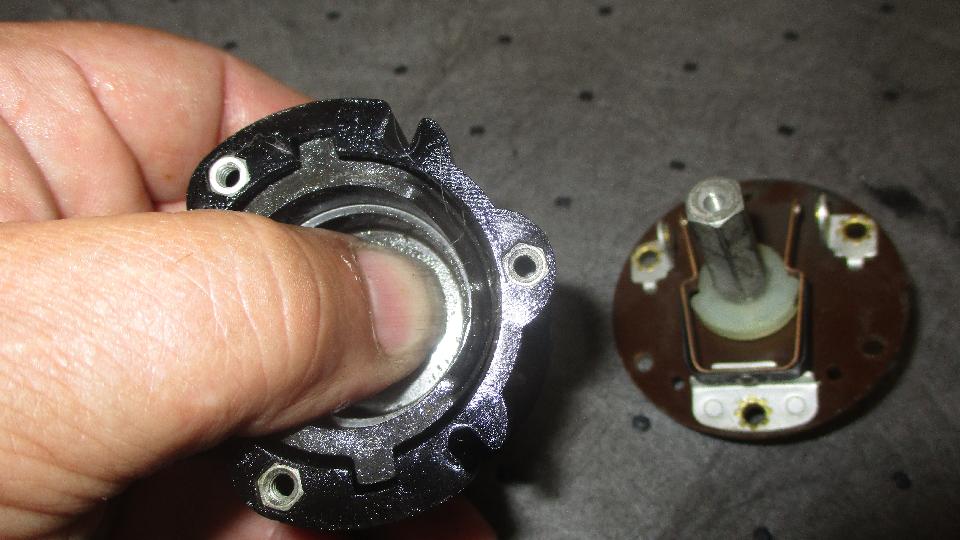 As the evening was winding down and folks were leaving, Brian and I strolled out to the garage to do an autopsy on the failed dipper switch. Not long to drill out two rivets in back and one in front to disassemble the switch, and then a few more minutes to get some photos of the internal bits.