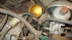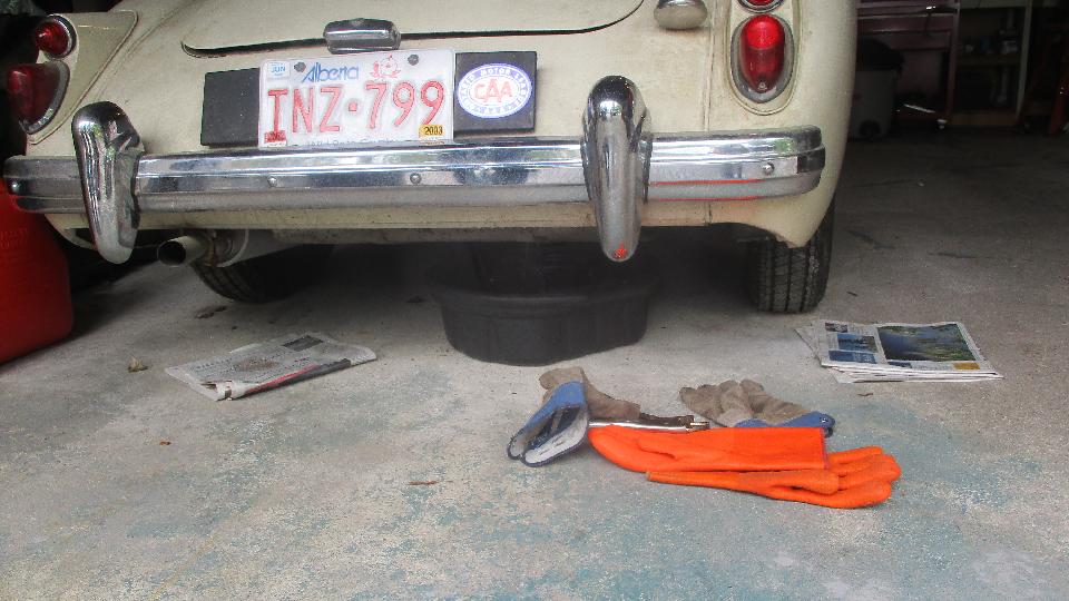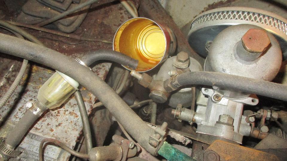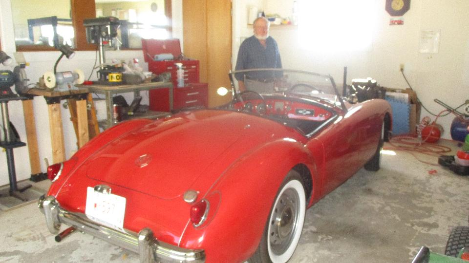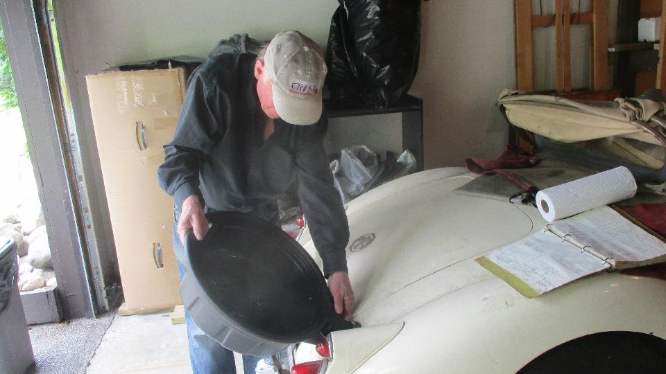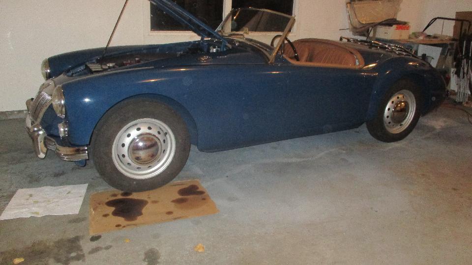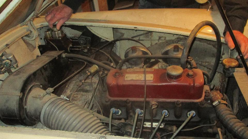 This would be a busy day. Back around the block to see what we can do for Bob Clark's long idle MGA. Drain the stale fuel, reinstall the drain plug, add a gallon of gas, drip, drip, oops. Drain the fresh gas, put a new fiber washer on the drain plug and reinstall it, put the gas back in the tank, then on to the engine.