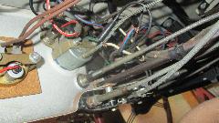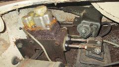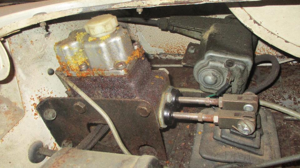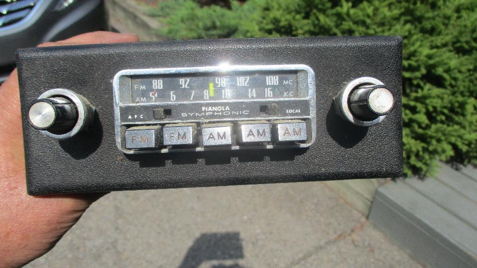 The master cylinder had crystallized glycol on it from long term wet cover (possibly leaky gasket), and the brake side of the reservoir was almost empty. The clutch worked okay (surprise), and it moved under its own power for the first time in 10 years, just out of the garage and back in, while the brakes were dragging with no hydraulic pressure. The hand brake pulled up tight without locking the wheels, and went slack when released while the brakes were still dragging. Diagnosis was frozen rear wheel cylinders, and dragging front disc brakes. Note for required service, new rear wheel cylinders, packing kits for the calipers and clutch slave (and maybe the master cylinder as well) and four new hydraulic hoses. Also to change all fluids, but this stuff looks minor when the momentum is cranked up. We had a few minutes to check out a nice AM/FM radio, Pianola Symphonic, which I think is circa 1970 or so.