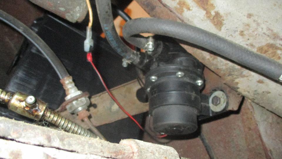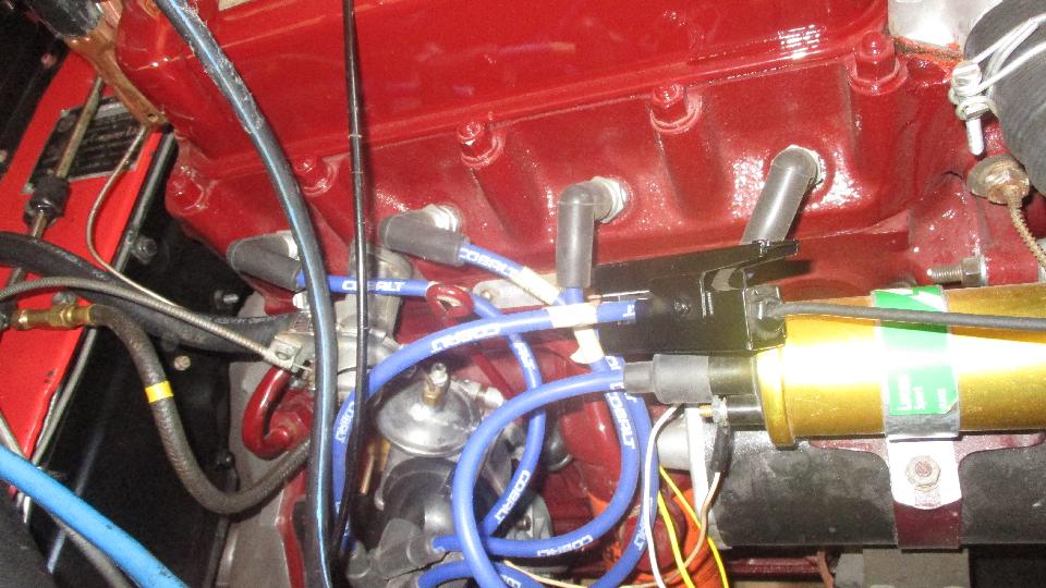 Installed new battery, and took the opportunity to set it up for negative earth and re-polarize the generator (and swap wires on the ignition coil). Fuel pump not running, so pulled it out to check it. ECCO aftermarket pump, vintage 2007, Fiberglass Reinforced Plastic structure with screw-in replaceable hose barbs. It turned out to be electronic and polarity sensitive. Swapped power and ground wires, and it works, so reinstalled it, purged the pipes, and reconnected hose to carbs. Adjusted choke link cable, pull full choke, apply a little throttle, pull starter switch, and produced an instant grin on Bob's face as it fired right up. Good oil pressure, temperature stabilized, running a little rough. Out of time, but will return later for the tune-up.