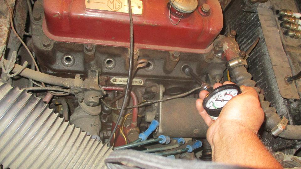 Back to Bob Clark's MGA, now that it runs (roughly) it was time for some diagnostics and a tune up. Quick to do a compression test for reference. Result is 120 +/-3 psi for all cylinders. Not bad for a long idle used 1500 engine.