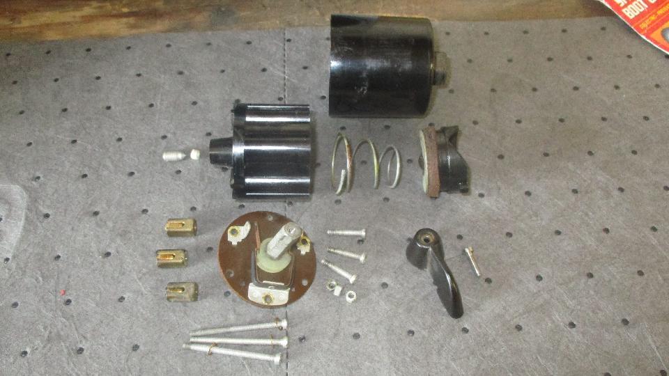 The moving parts are a forked yoke with square neck for alignment in the housing, and a rotating square bobbin carrying the moving electrical contacts. Fixed position parts are the pot metal housing and phenolic rear plate, and three phosphor-bronze spring contact fingers. The center finger is the power input terminal, and it has a hook at the bottom end. When the switch is kicked, the square bobbin is pushed downward where the hook catches a corner of the bobbin to make it rotate 1/4 turn, which in turn presents moving electrical contacts alternately to one or the other of the output fingers.