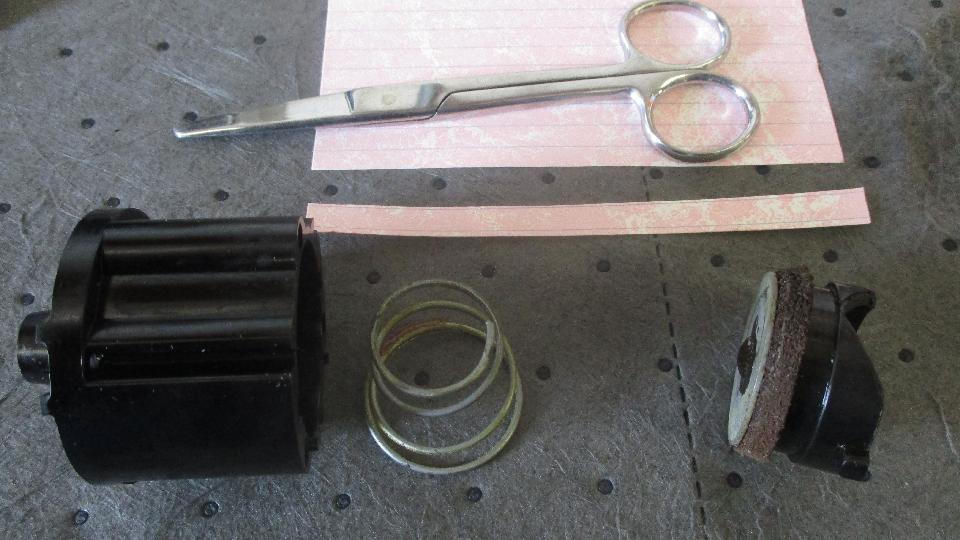 There was mention that the turn signal switch had to be held on to prevent instant cancelling, so it was time for a bit of fettling. One knob, one bezel nut, three wires, and it was on the bench. Six more screws and one set screw, and it was disassembled for cleaning. As usual the the leather vacuum cup was not sealing in the cylinder, so we cut a thin strip of card stock to insert behind the edge of the leather cup (or in this case two strips) to bring it into intimate contact with the cylinder wall.