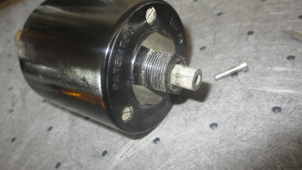 One of the contact fingers was curled up, like maybe the bobbin had over-traveled and caught underneath it before returning upward. The forked yoke with square shank was a very loose fit in the housing, so the yoke could wobble around a lot. The only thing restraining this wobble would be the step cap that was riveted to the top end of the yoke. In some combination of motion the yoke came into contact with one of the output contact fingers, resulting in short to ground on the housing (through the yoke), as witnessed by the badly burned contact and a mating burn mark on the yoke. Additionally, it looks like the ends of the square rotating bobbin may not be exactly perpendicular to the rotational axis, and the two arms of the yoke may not be exactly parallel. Result of all that is binding of the bobbin in the yoke at one point of the rotation. This binding point is illustrated in the picture where the supporting axle pin is lying on the table while the bobbin is still stuck in the yoke.