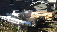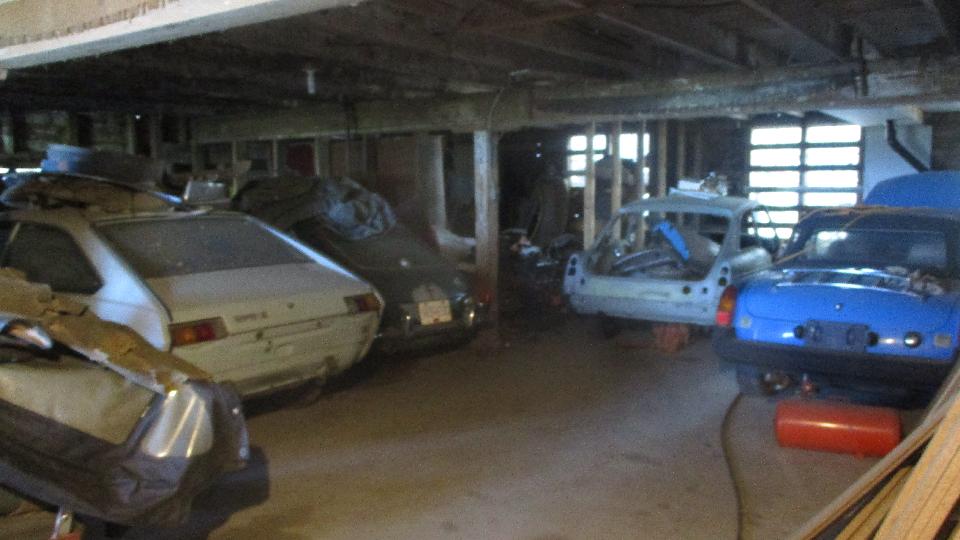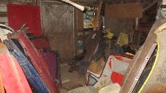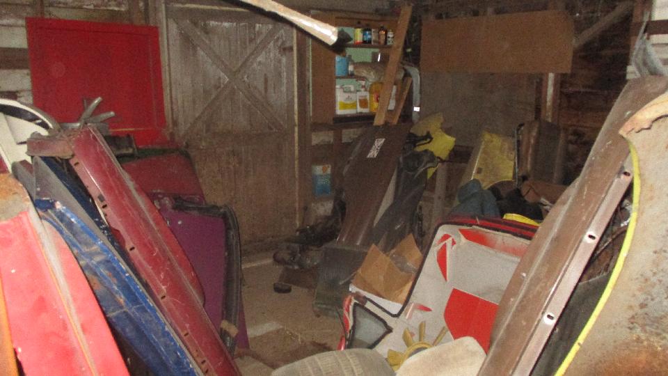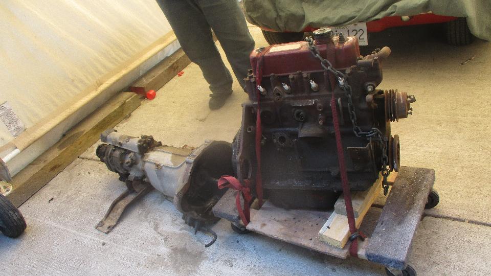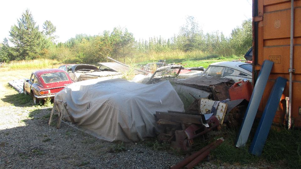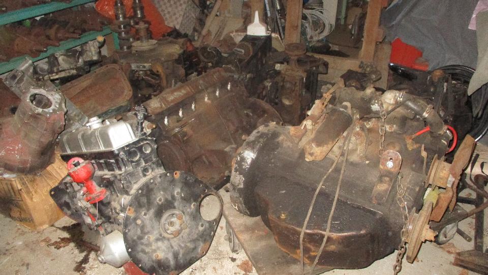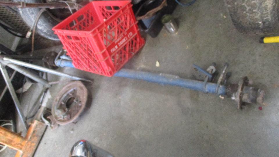 Back in the workshop, the tail section of another MGB waiting to be turned into an MGB trailer (and the light axle to match), as well as the MGA Coupe he drove to the Monday night club meeting.