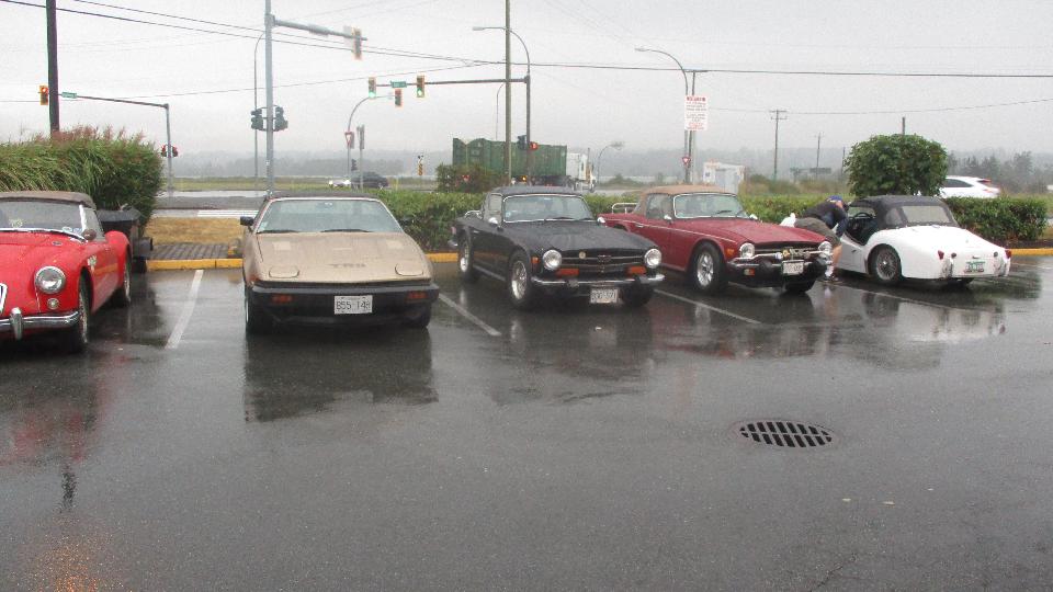 After crossing the border at Sumas, WA (27 miles east), we found one more TR waiting for us, but that car had no screenwipers, so he elected to return home (after putting the top up).