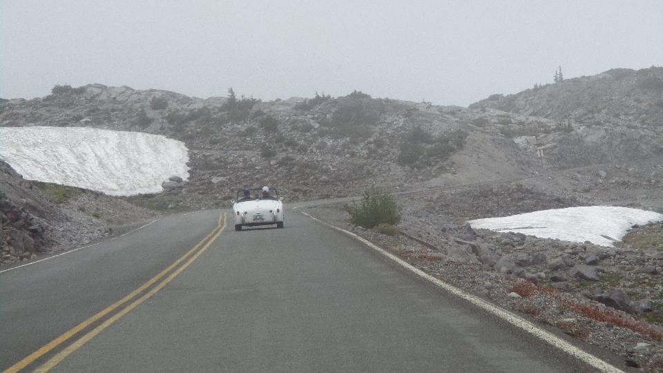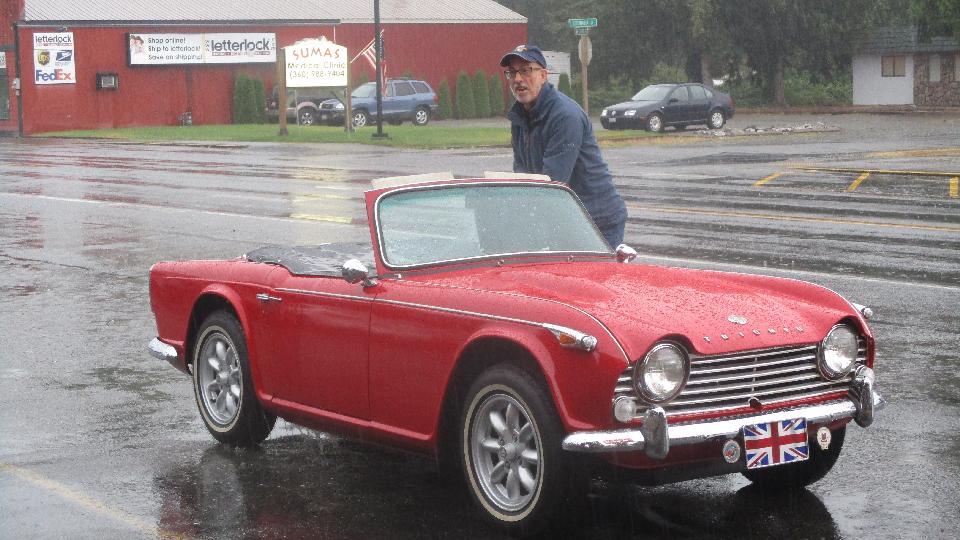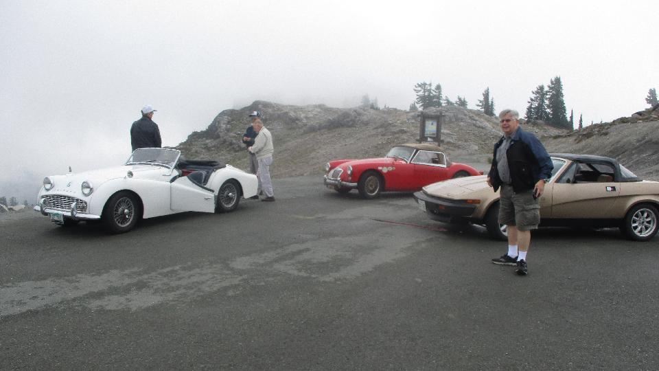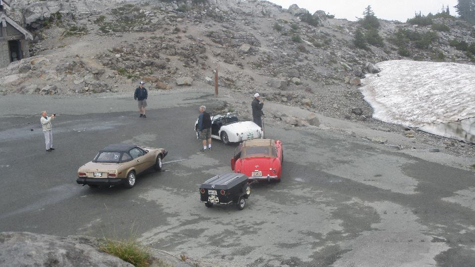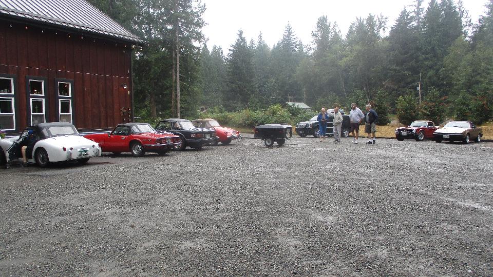 This looked a bit fishy at first. A club cruise on a Friday? Old English Car Club of British Columbia, Vancouver Coast Branch, had scheduled a "Mount Baker Run" beginning in Surrey, BC, crossing the country border into United States, stop for lunch, and a run to the top of Mount Baker. The event was not on the Branch web page, but was on the web page of the parent club. After multiple attempts, no contact was established with either organization, so we decided to just show up to see if this event was for real. Yes, it was real. So why on a Friday? It's tradition, for several years now. First Friday after labor Day, kids are back in school, and not much tourist traffic on a week day. Okay, whatever works. We met with four cars from the Vancouver club in Surrey, all Triumphs by coincidence. The rain didn't look so bad, so we all elected to continue the run.