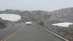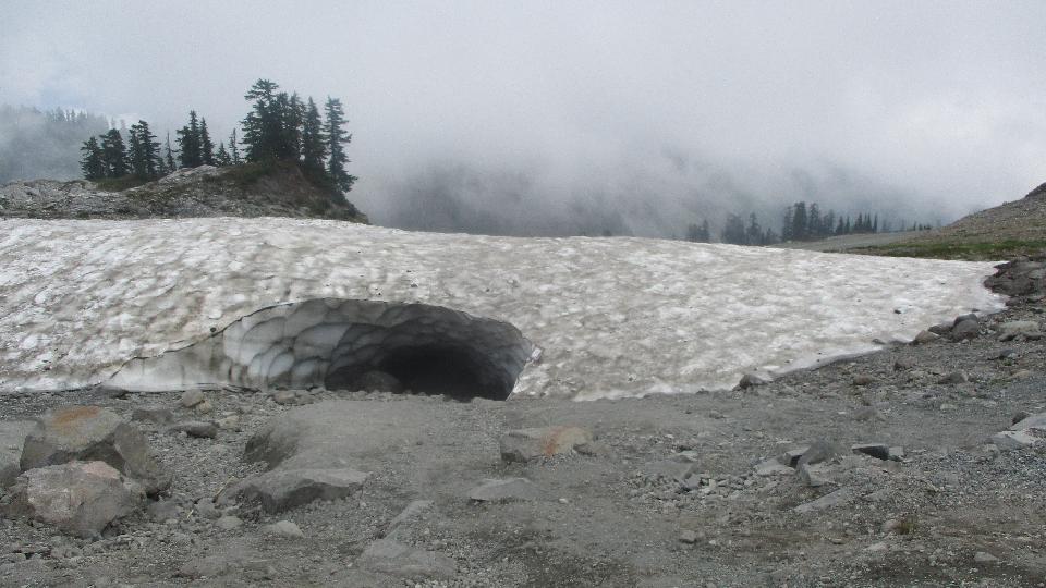At the top, one mile high, nice sweat shirt weather and some melting snow fields with clouds around and below us to limit visibility. Nice mountain.