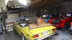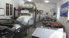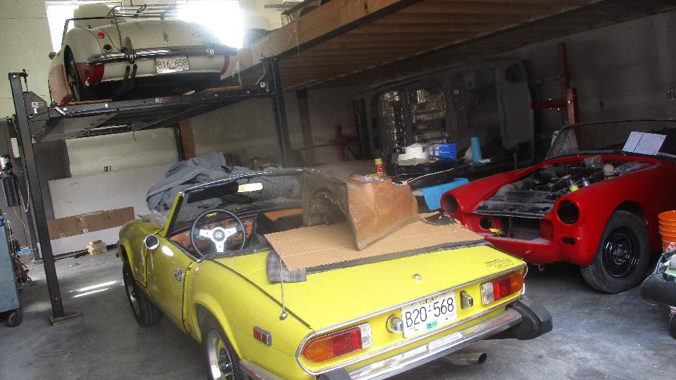 Say hello to Kelly McPherson, owner of BBC. Today he was doing some restoration work, up to his third knuckles in spray glue applying vinyl to a trim piece. In the shop today was a very nice Spitfire a big Healey, and a Midget (Kelly's personal project). There were also two TR7's, one in primer nearing completion, and another restored body shell (next in line). The MGB 5-main engine and 4-syncro OD gearbox were from a parts car apparently available if anyone needs them.
