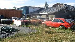 Early morning visit to Doug Holburn in Abbotsford, BC. Been here before on June 27, but this time there was a coffee and donuts breakfast meeting with several friends, and we had just enough time to squeeze it in. The business name is All British Cars/West Highland Coach House, sometimes known as CRAP central (Classic Restoration And Preservation). There are lots of vintage British cars sitting around this place, and a few more oddballs in the bunch.