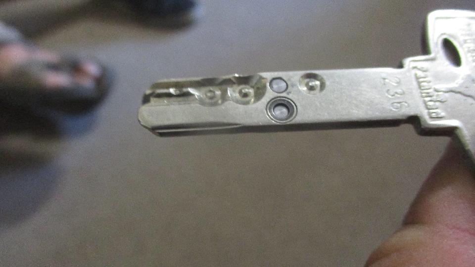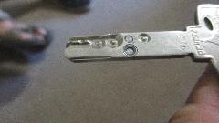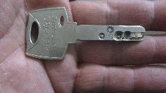 One of the guys was a locksmith, and had an interesting key for show and tell. This one has five cylindrical side actuted tumblers, each one having a tumbler pin coaxial within a cylindrical tumbler, making for a 10-tumbler lock (with reversible key). The two plug buttons midway along are not tumblers, but are anti-pick features.