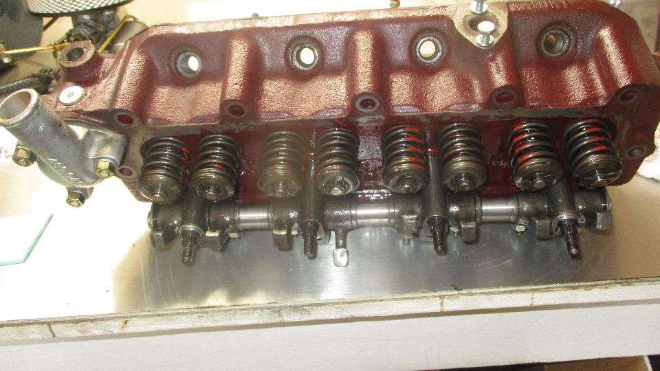 By early afternoon we were 25 miles farther west to visit Roland Falcioni in Port Coquitlam, BC. We met him at the Tuesday night club meeting. He has an nice MGA, but was concerned about considerable smoking out the tail pipe with only 100 miles on the new engine. It had good compression readings, so probably not a piston or rings problem. So off with the head for internal inspection. Pistons and cylinder walls looked okay with some carbon on the piston tops and a wee bit of honing marks still visible on the cylinder walls (but not enough to account for the oil consumption). Then we began to remove valve springs to check the valve guides, and found the problem immediately. Someone (who shall remain nameless) had installed umbrella seals on top of the valve guides, which could be okay, except the original valve shrouds were still in place. The shrouds work like a guillotine to shear off the rubber seals immediately during installation, before the engine ever get to run. The fix for this is to remove the shrouds, replace the spring caps with later model parts having larger pilot diameter for the inner valve spring, and reassemble it with new umbrella seals.