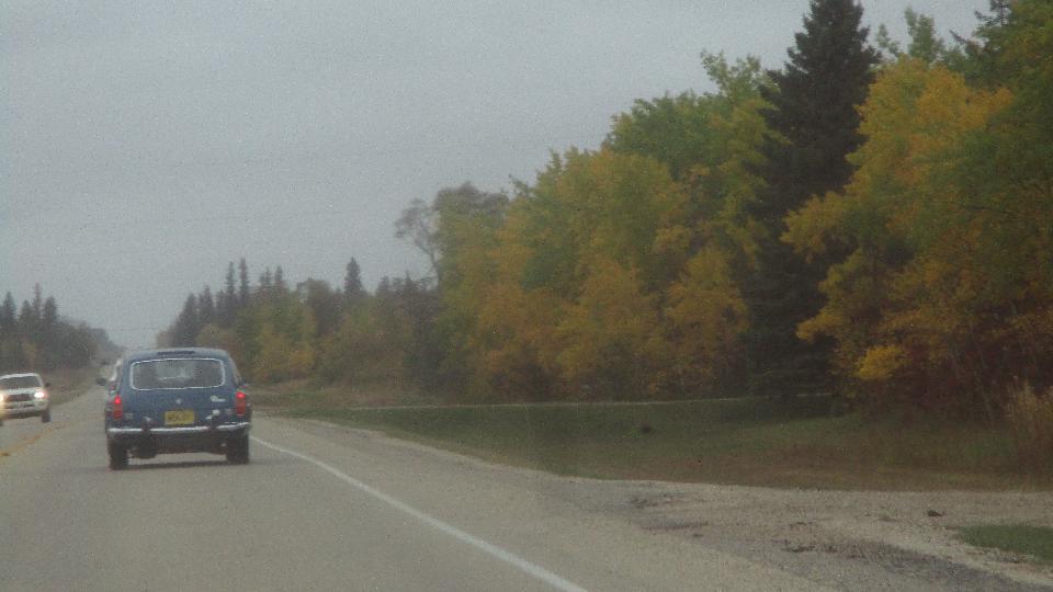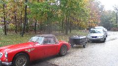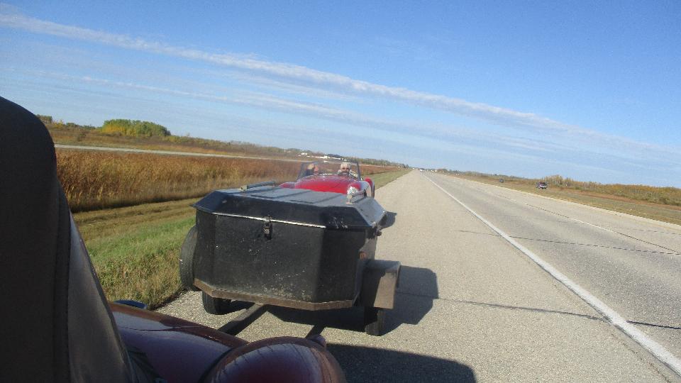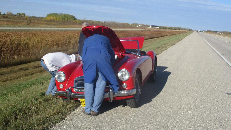 Off to visit Austin Healey Club of Manitoba today. There are MGs in this club too. They would be meeting at someone's home in the country for a business meeting and social. Rainy day, sloppy roads. Figured we must be going in the right direction when we were following the MGB GT, and we were. I think we had 25 people for the club meeting, some spilling over into another room. They were rather entertained or amazed by what the MGA guru was doing all over North America. We managed to collect another shop address, and invitation to a club tech session on Wednesday (if we happen to still be around by then).