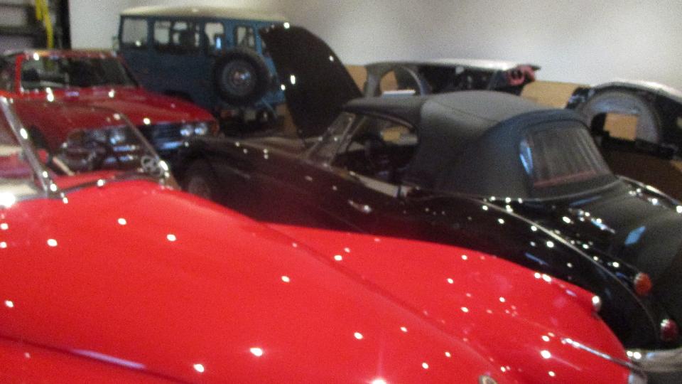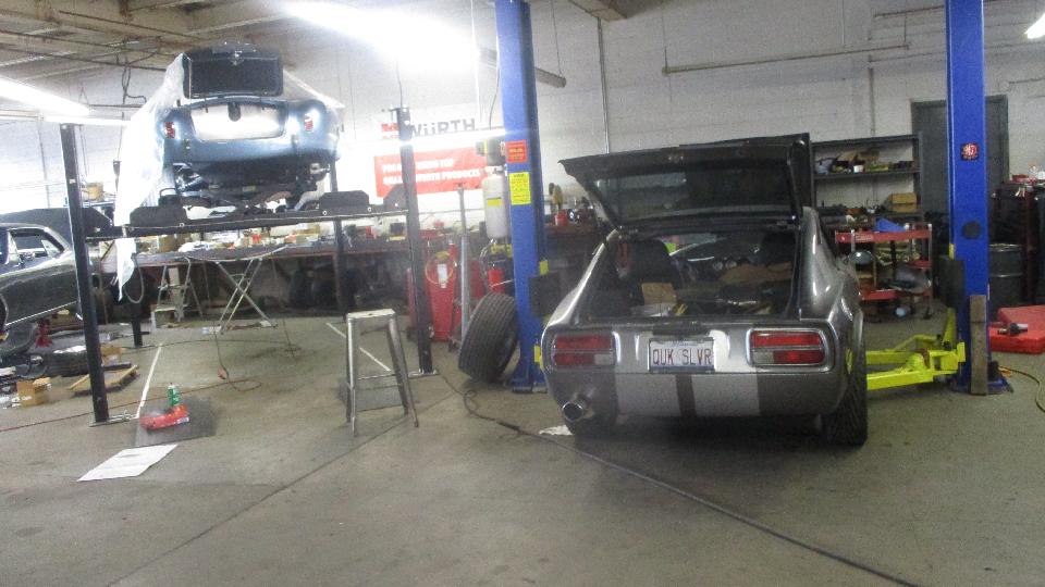 That would be a Jaguar E-type Coupe, a Cobra (and a couple of Datsun Z cars), a very vintage Rolls Royce (I think), and something rare and very Italian.