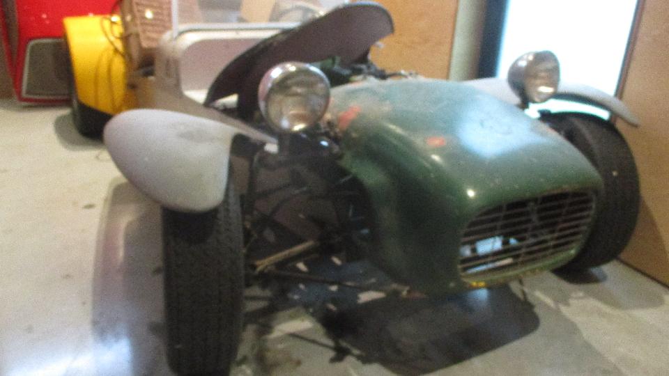 He has quite a collection of vintage British cars rather well stuffed into available garage space. The Lotus 7 replica is some kind of 1098cc Austin or Morris underneath, and may be up for grabs. Making my way past the Jaguar XK 120, big Healey and Triumph Stag, I smiled at the 70's something Land Rover, all original and looks like new. To the left of the Stag was a Land Rover trailer to match.